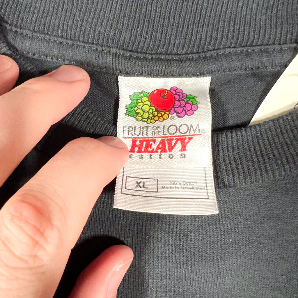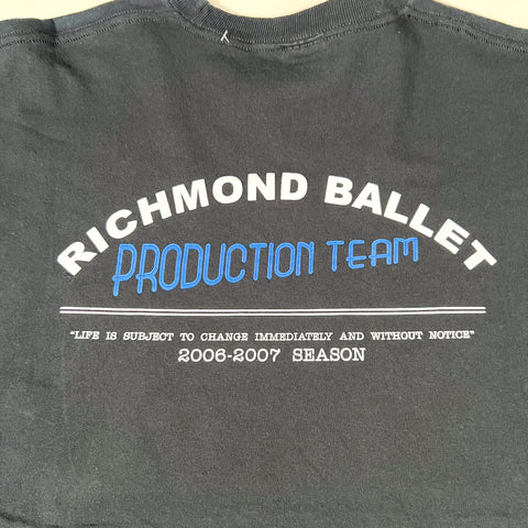 Richmond Ballet Production Team tee from the 2006–2007 season, printed on a Fruit of the Loom Heavy Cotton blank. Features the stylized “R” dancer logo on the front and a large back graphic with Production Team lettering and the classic quote: “Life is subject to change immediately and without notice.” Soft, sturdy cotton with an easy everyday fit.