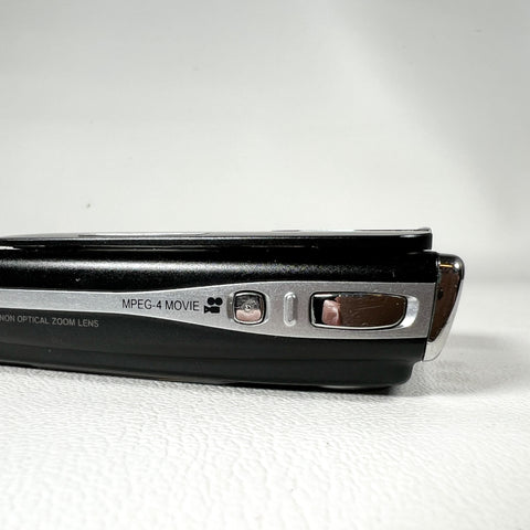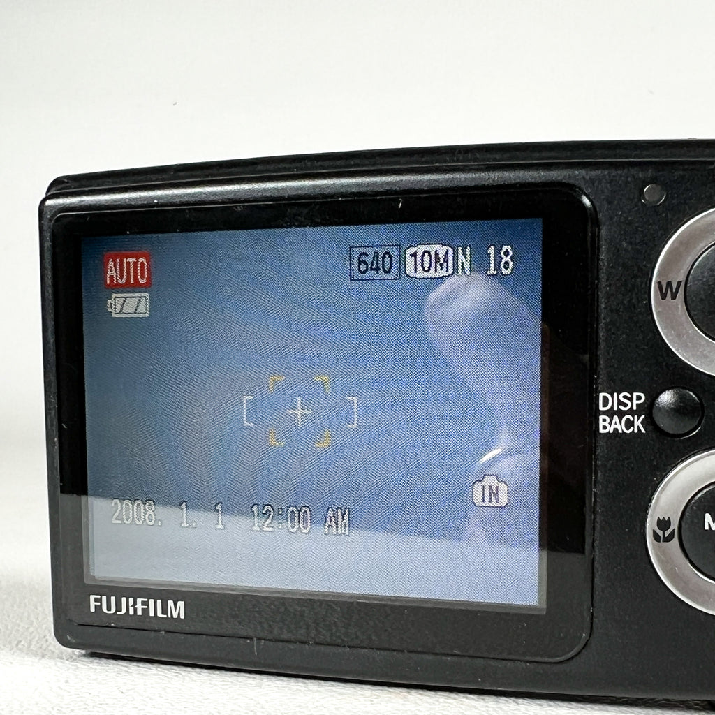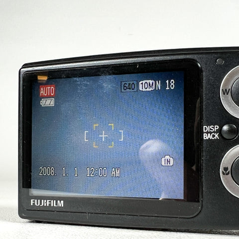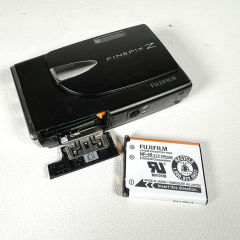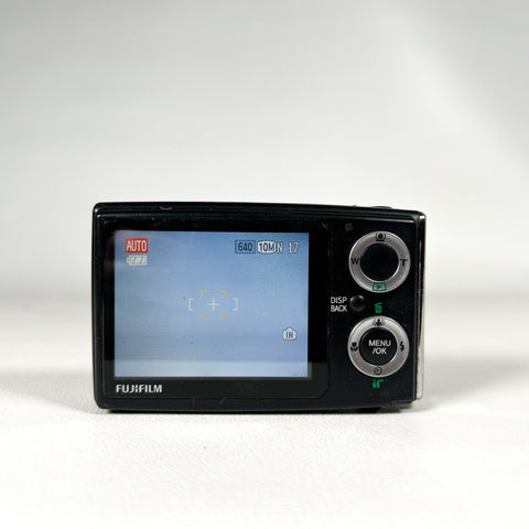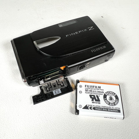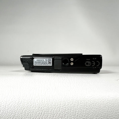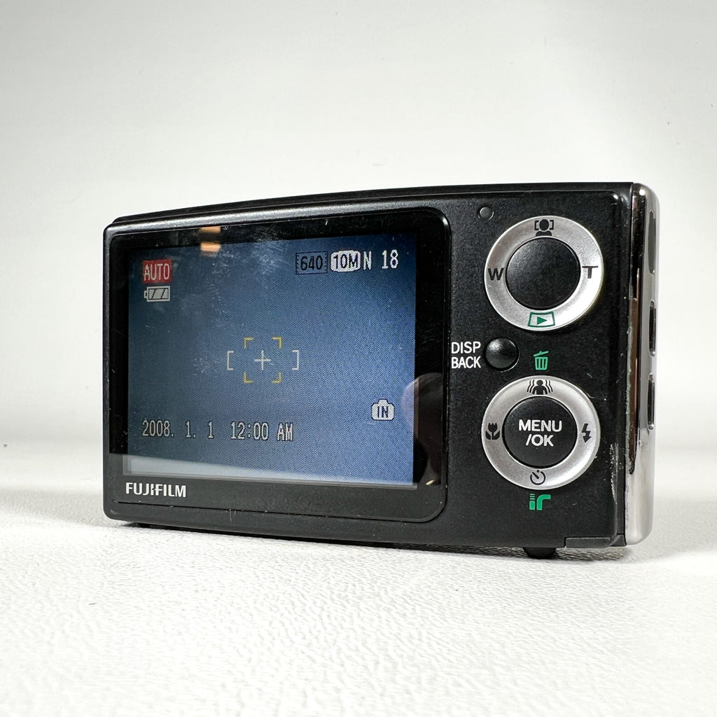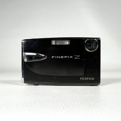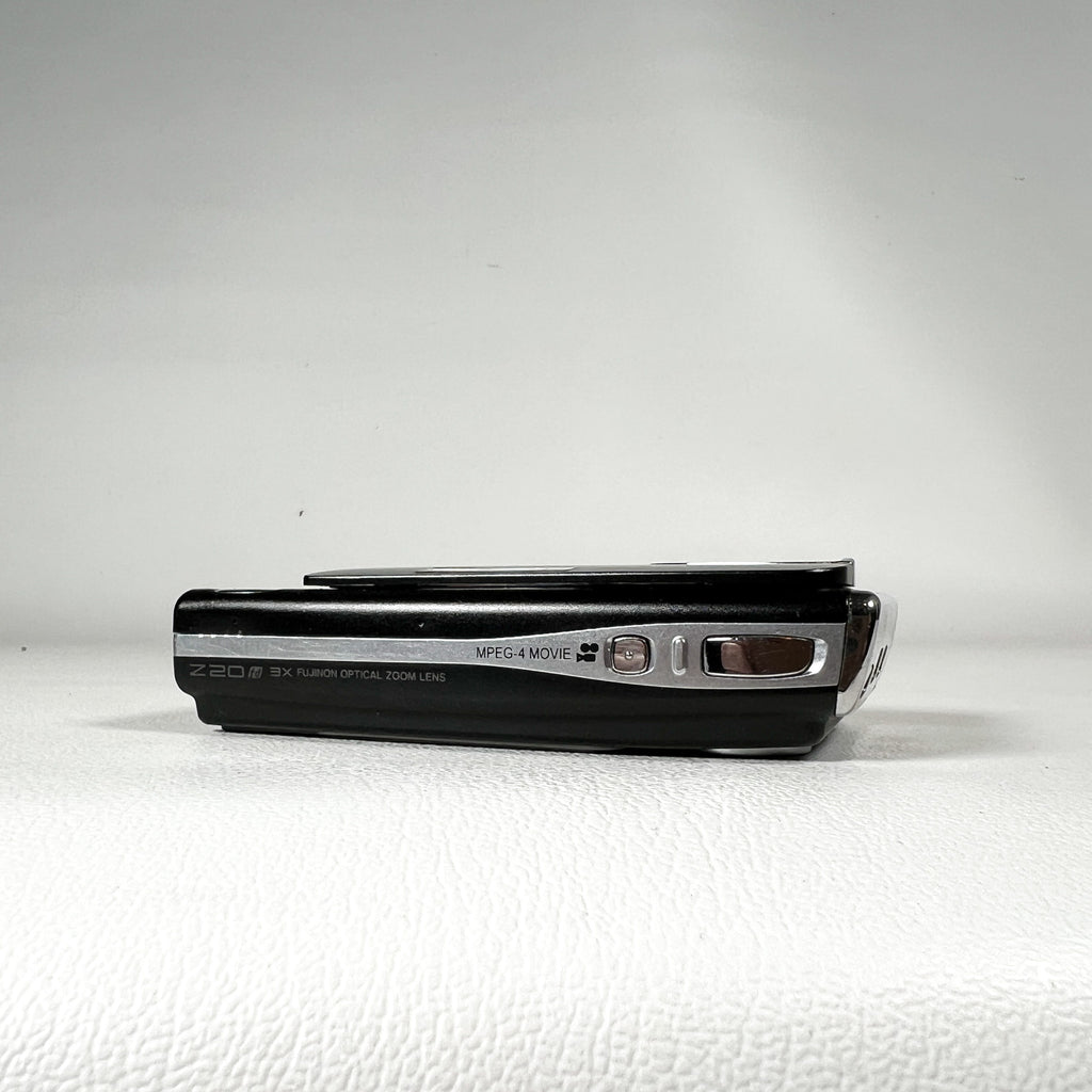 Ultra-slim late-2000s Fujifilm FinePix Z20fd in glossy black with the iconic sliding lens cover design. The Z20fd features a 10.0 megapixel sensor, 3x Fujinon optical zoom lens, and Fuji’s Face Detection (fd) technology, delivering classic early-digital color in a sleek, pocketable body. This model is known for its stylish design, simple controls, and fun “digicam” look.