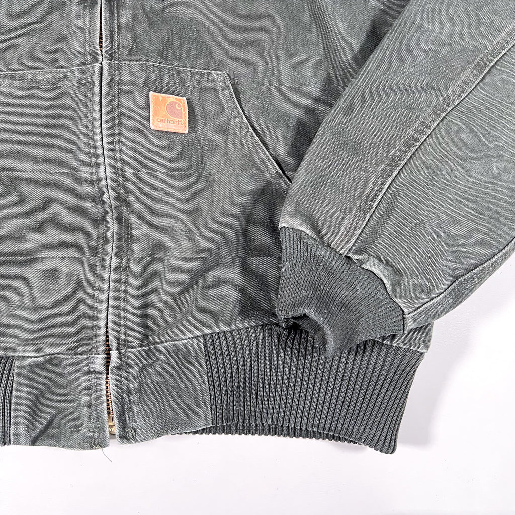 The J130 is Carhartt’s classic active jacket silhouette, featuring a full zip front, attached hood with drawstrings, ribbed knit cuffs and waistband, and front hand pockets. This example shows natural fading and wear consistent with use, giving it a broken-in, authentic workwear look.