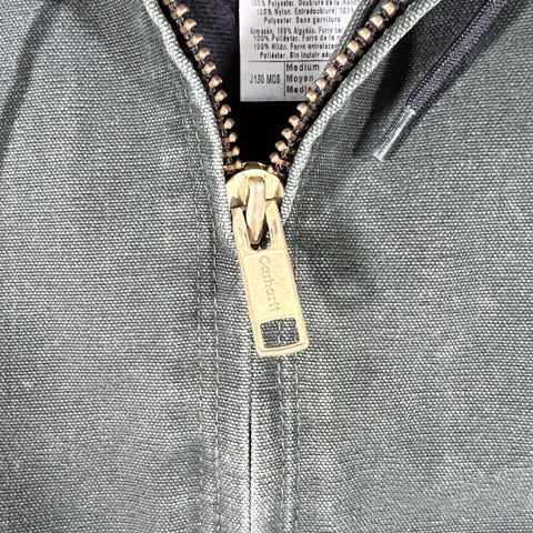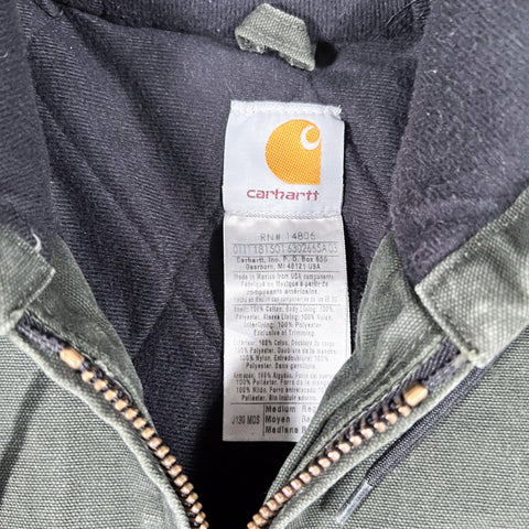 Modern Carhartt J130 Insulated Active Jacket from 2011 in the Moss Green (MOS) colorway. This model features a heavyweight cotton duck shell paired with quilted insulation throughout the body and sleeves, designed for warmth, durability, and everyday wear.