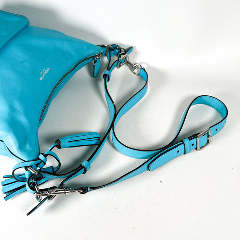 Coach Legacy Leather Courtenay Hobo in a bright aqua blue leather. This 2013 Coach style features a slouchy hobo silhouette, top zip closure, front turnlock pocket, dual tassel accents, silver-tone hardware, and both a short shoulder strap and longer adjustable crossbody strap.