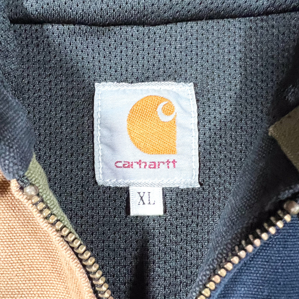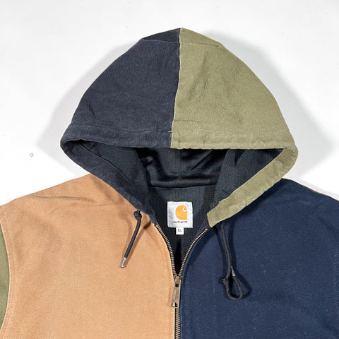Modern Carhartt colorblock full zip hooded jacket featuring a four-panel design in navy, olive, tan, and black. Mid-weight canvas exterior with a soft mesh lining. Includes ribbed cuffs and waistband, kangaroo pocket, and leather Carhartt square patch on the front. Tagged XL but fits like a size large based on measurements.