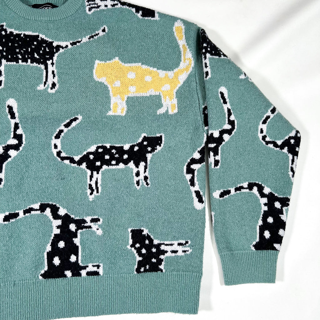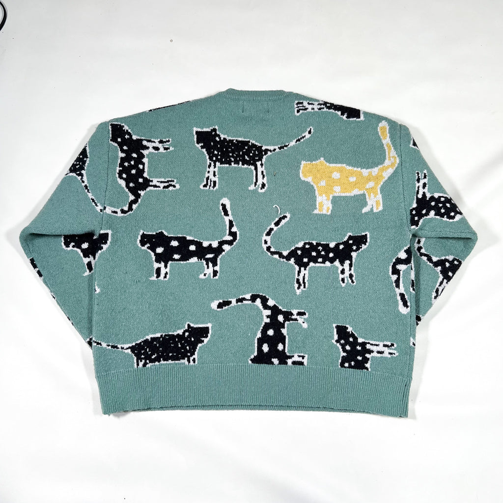 Playful and cozy cat-patterned knit sweater by Cider, featuring an all-over graphic of abstract cats in black and white with one standout yellow cat for a pop of contrast. Set against a soft sage green background, this sweater blends bold patterning with a relaxed, boxy fit for easy everyday wear.