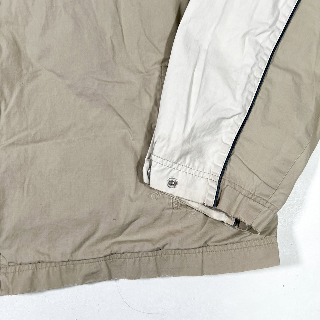 Early 2000s GAP windbreaker featuring a clean, minimalist two-tone color block design in cream and sand beige with subtle navy piping accents. Made from 100% cotton with a breathable mesh polyester lining, this lightweight jacket captures classic Y2K casual styling — perfect for layering through transitional weather.