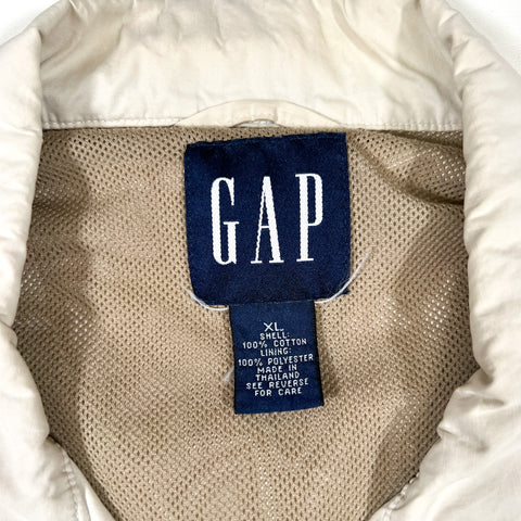 Y2K GAP jacket, beige windbreaker, color block jacket, 2000s minimalist style, GAP outerwear, vintage GAP, neutral streetwear, cotton zip jacket, early 2000s fashion, retro GAP pullover