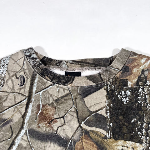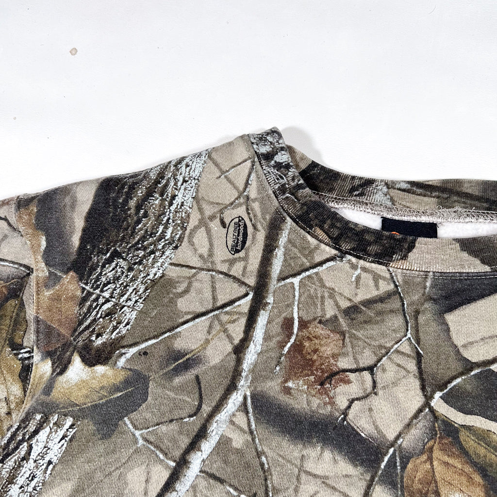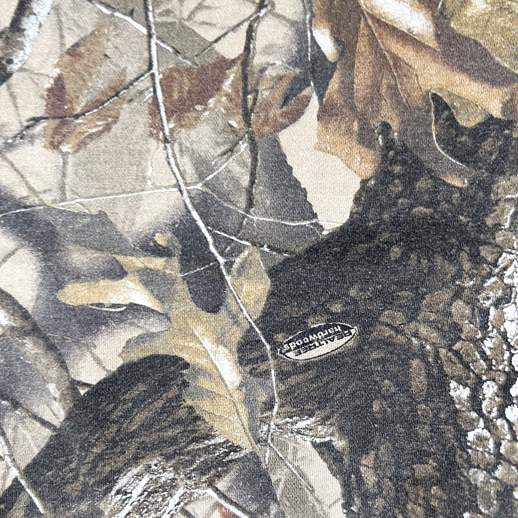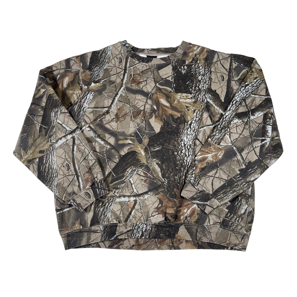 Y2K Outfitters Ridge camo fleece crewneck featuring a hyper-detailed woodland print with branches, bark texture, and fall leaves throughout. Soft white fleece interior, ribbed collar, and a roomy outdoor fit. Ideal for layering, hunting, or streetwear styling. Fits like a modern large to extra large.