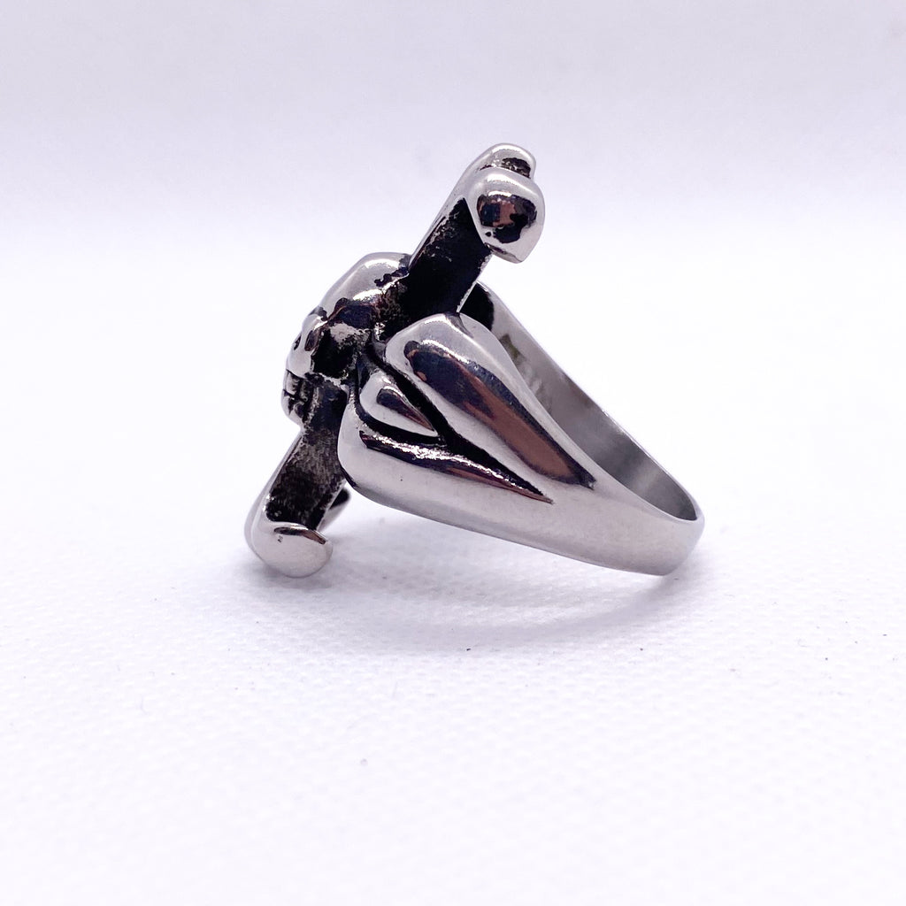 A bold fusion of gothic and classic symbolism, this modern stainless steel ring features a menacing skull centered within a fleur-de-lis cross. The polished silver-tone finish and blackened recessed details give it striking dimension and contrast. Its smooth, tapered band offers comfort while maintaining a substantial, statement-making weight.