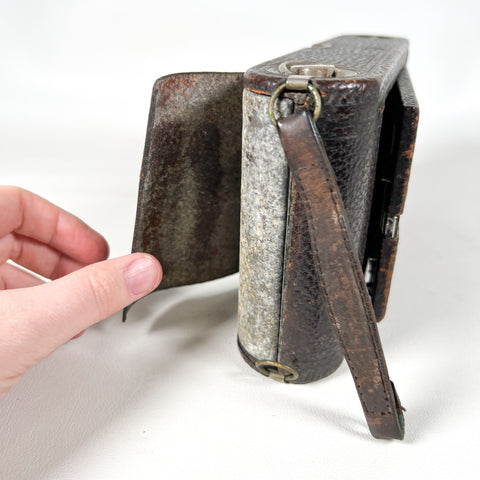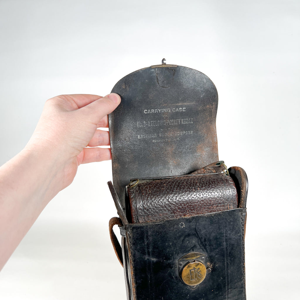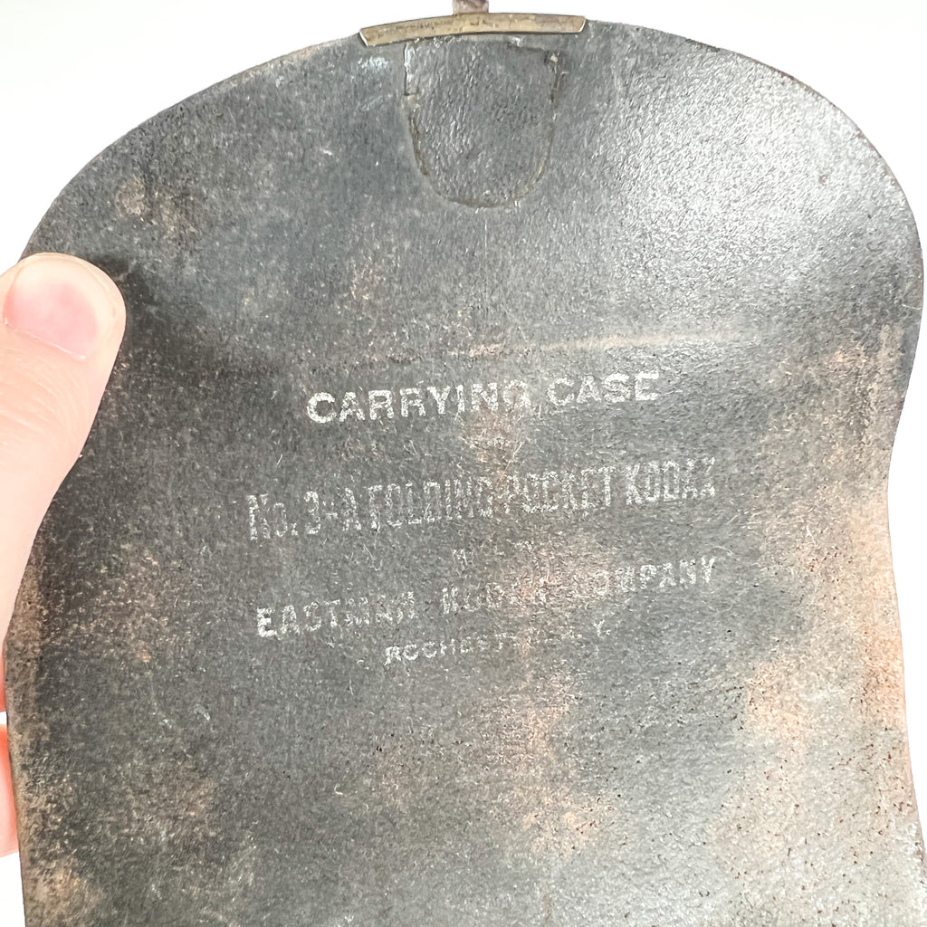 Early 1900s Kodak No. 3A Folding Pocket camera in the classic “postcard format” folding design. This is a beautiful piece of photo history with a red bellows, wood bed rails, and original Kodak/Eastman hardware. Includes the original leather carrying case (case is stamped for the No. 3A Folding Pocket Kodak).