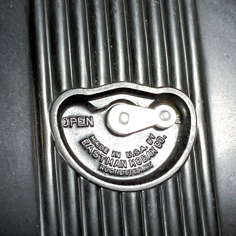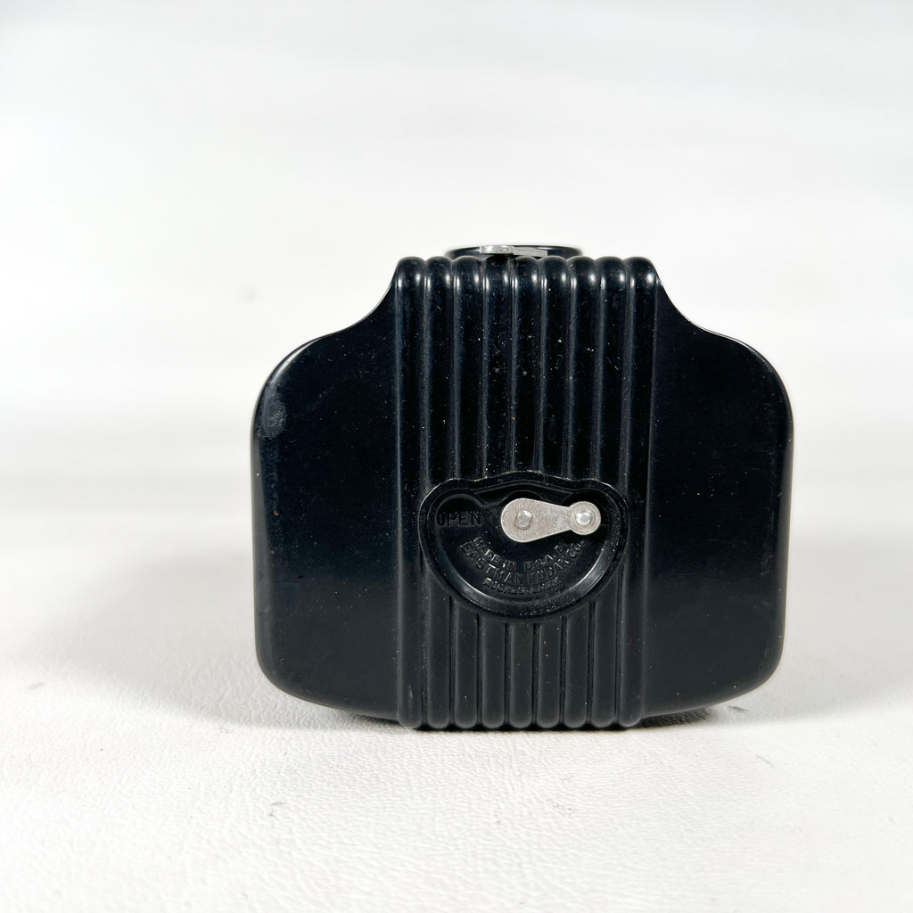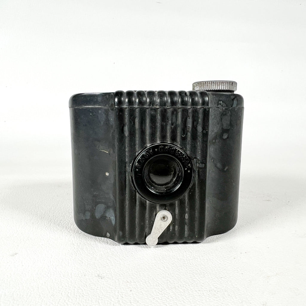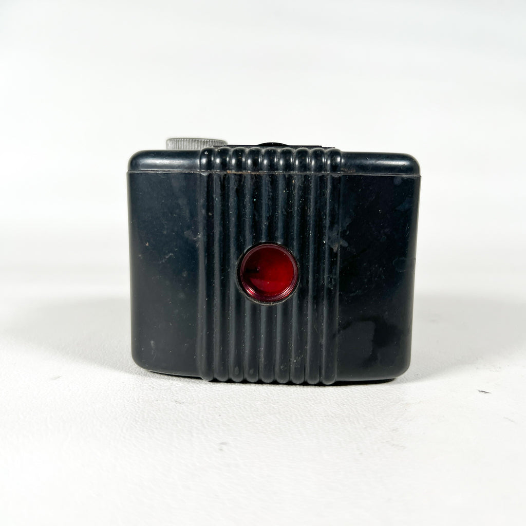 Vintage Kodak Baby Brownie box camera produced by the Eastman Kodak Company beginning in 1934. This compact Bakelite-bodied camera features the original “Baby Brownie” meniscus lens, rotary shutter, top-mounted winding knob, and rear red exposure window. Manufactured in Rochester, New York, USA.