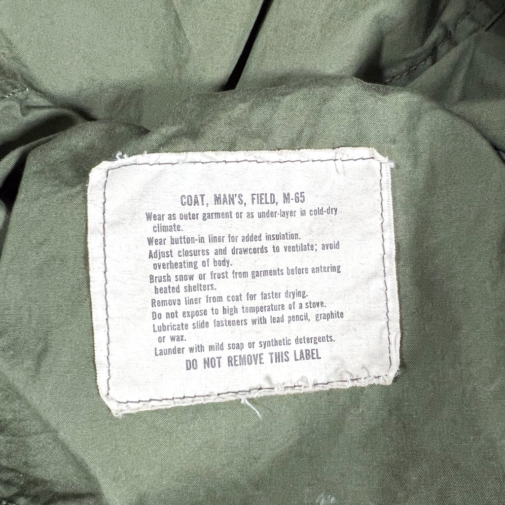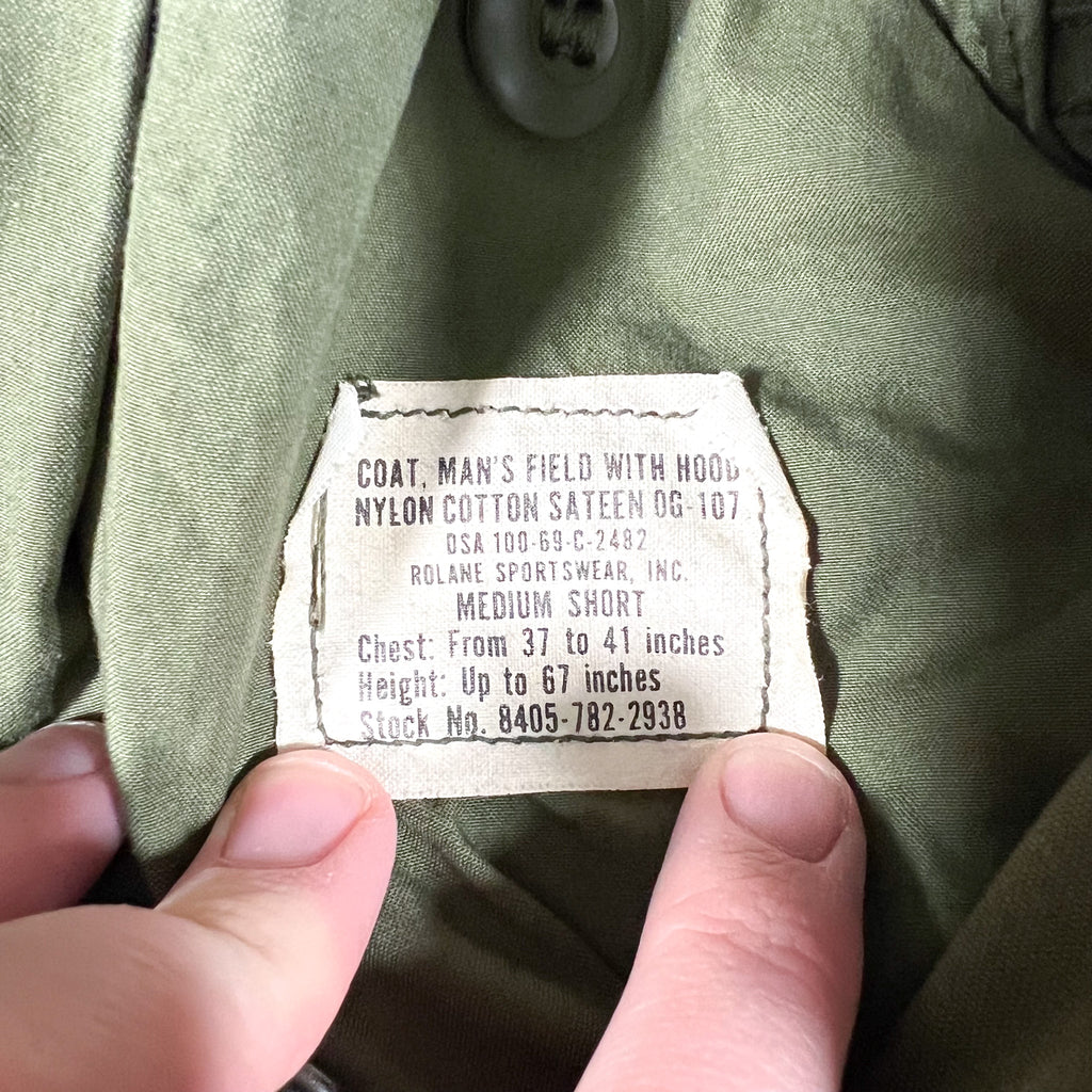 Interior labeling indicates Rolane Sportswear, Inc. production with a 1969 contract, consistent with late-1960s government-issued M-65 jackets. Designed to be worn as a shell or layered with a button-in liner (liner not included), the M-65 became one of the most iconic and enduring military jackets ever produced.