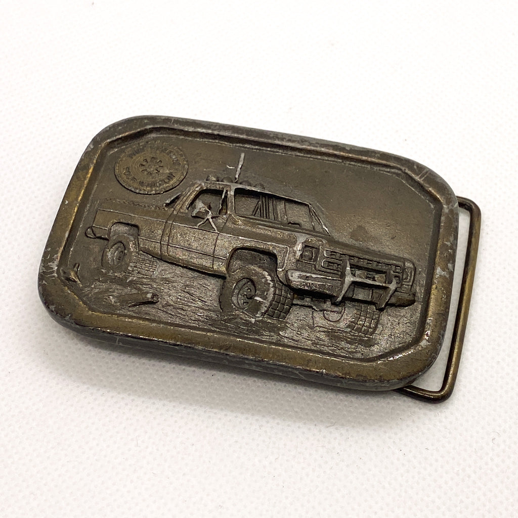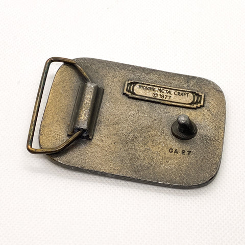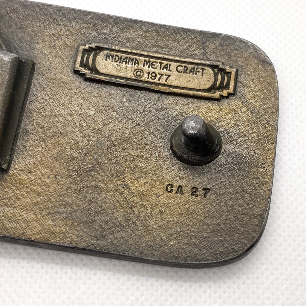 This buckle shows authentic wear and patina consistent with age, including surface scuffs and oxidation that enhance its vintage character. The reverse is stamped Indiana Metal Craft ©1977 with model code CA 27, confirming originality and period production. A strong example of 1970s Americana, ideal for collectors of vintage belt buckles, 4x4 culture, or classic truck memorabilia.