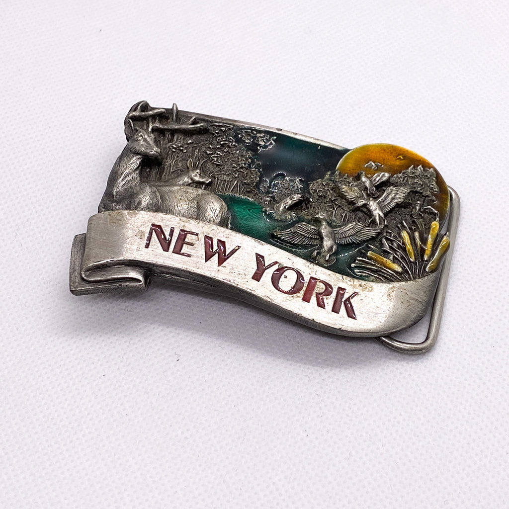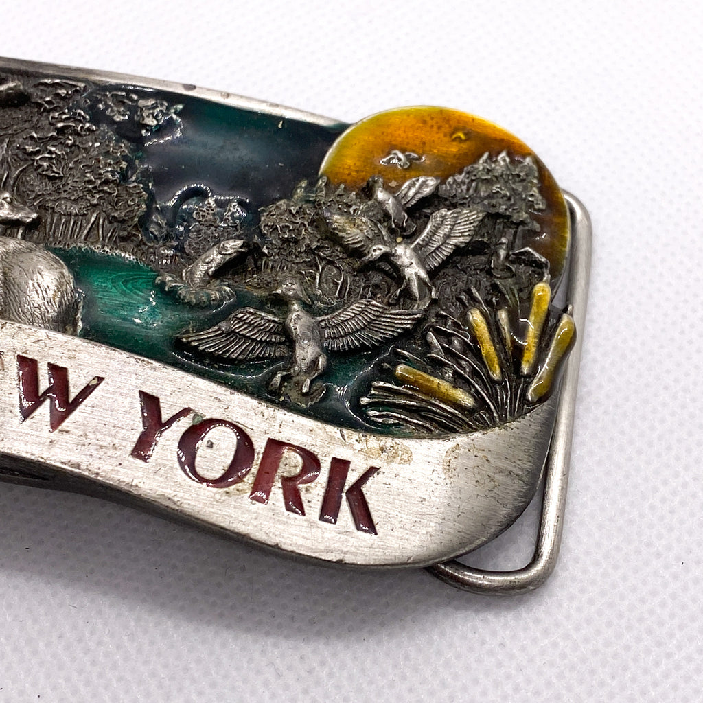 Authentic vintage New York souvenir belt buckle by Bergamot Brass Works, dated 1984. This detailed cast metal buckle features a scenic wildlife design with deer, ducks in flight, cattails, forest trees, and a pond under a sunset sky. The raised “New York” banner across the front gives it a classic travel souvenir look that pairs well with western, outdoors, or Americana fits.