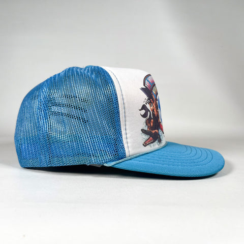 Original vintage snapback from the 1984 Louisiana World Exposition held in New Orleans. This hat features a bold, colorful graphic on the front panel reading “The World’s Fair New Orleans 84,” with detailed artwork including alligators and classical figures, paired with a bright blue brim and matching blue mesh back.