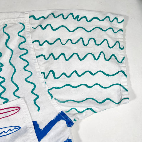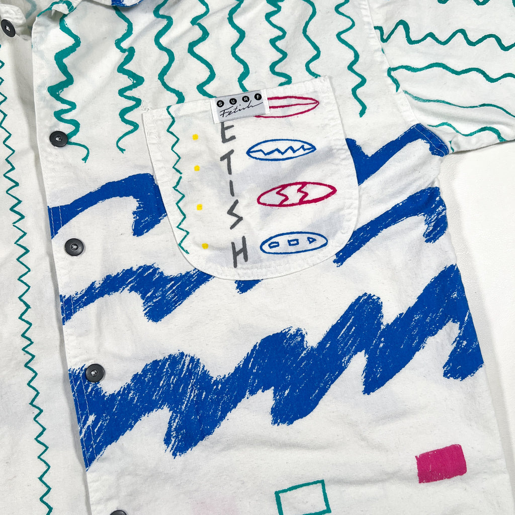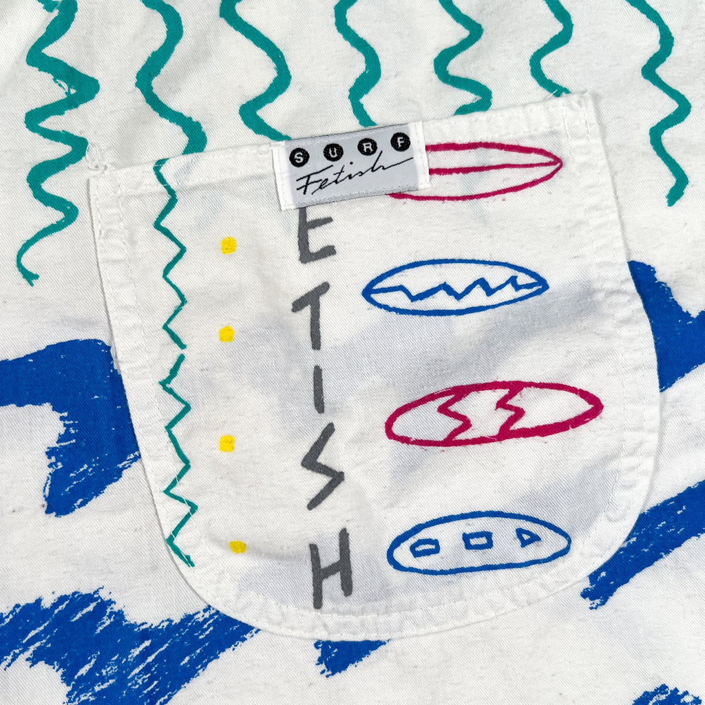 Original 1987 Surf Fetish California short sleeve button up shirt featuring an all-over colorful surfboard and wave pattern. Classic 80’s California surf style with bold graphics, vibrant colors, and abstract geometric prints. Lightweight 100% cotton with one chest pocket and branded Surf Fetish tag.