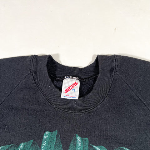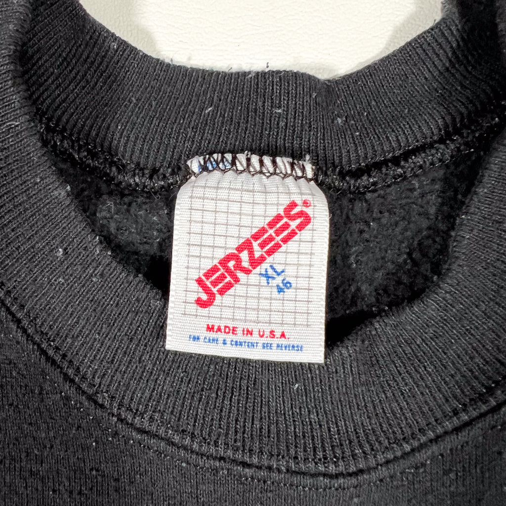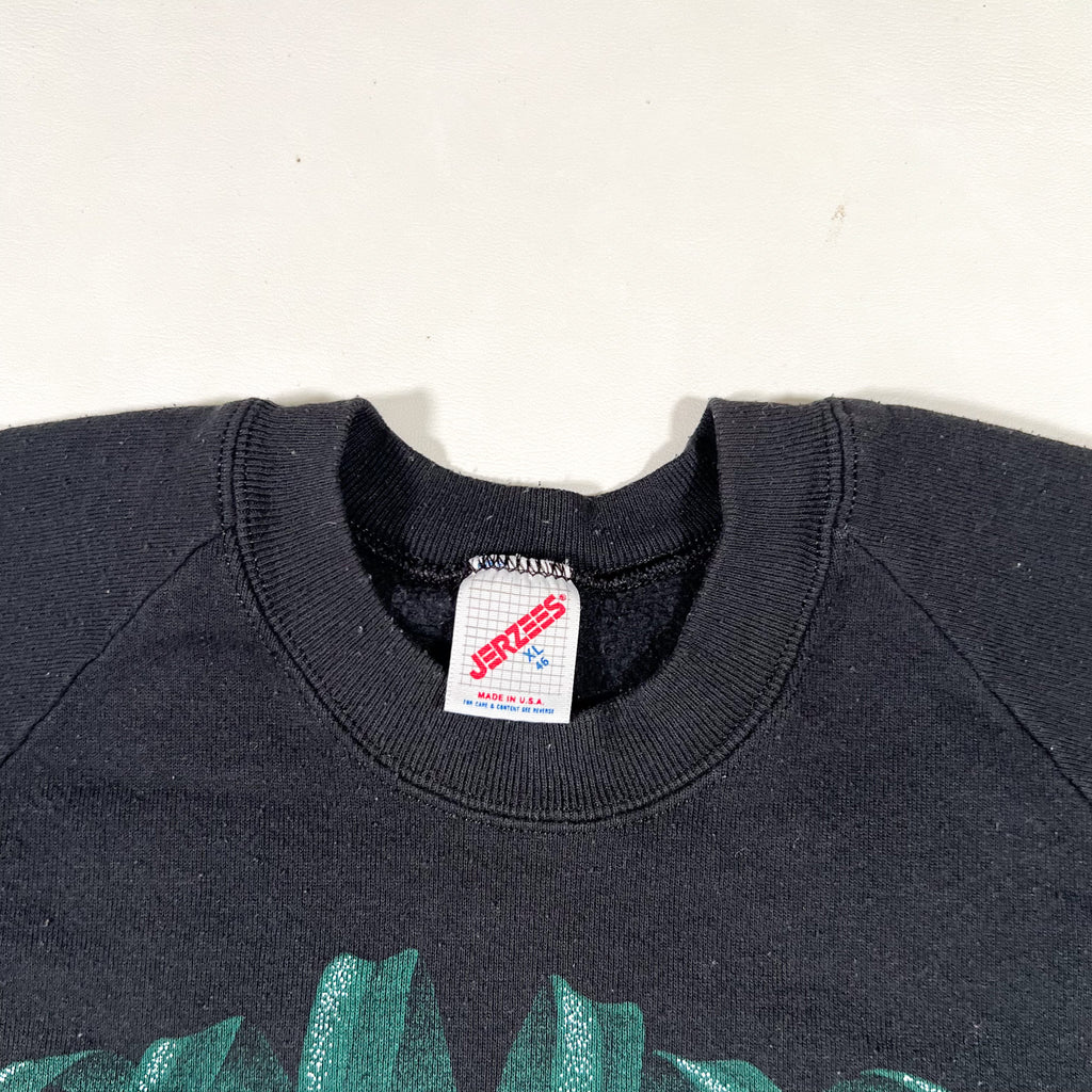 Vintage 1989 black crewneck sweatshirt featuring a bold panther graphic printed across the chest. Classic late-80s wildlife artwork with strong colors and a detailed illustration. Made in the USA on a Jerzees blank with raglan sleeves and a soft, broken-in feel.