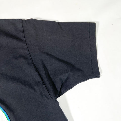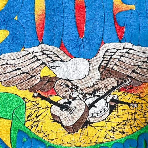 Original 1991 ABATE of Indiana “Boogie” biker festival T-shirt — celebrating the 11th annual event in Bean Blossom, Indiana. Printed on a black Hanes Fifty-Fifty tag (Made in USA), this shirt features a large front eagle-and-guitar graphic with vibrant cracked ink and bold colors, plus a back hit that reads “The Midwest’s Best Biker-Fest! Bean Blossom, Indiana.”