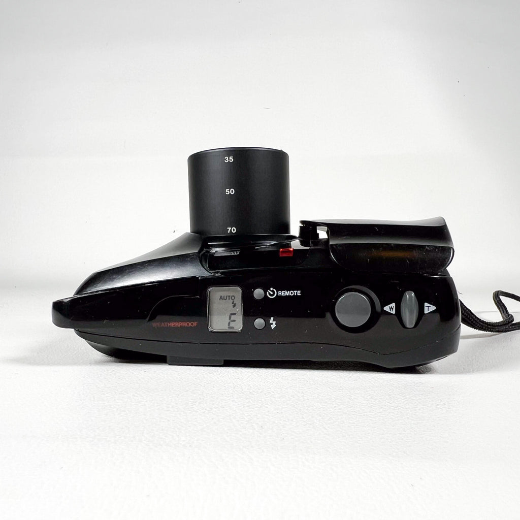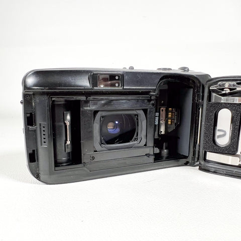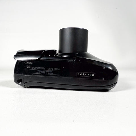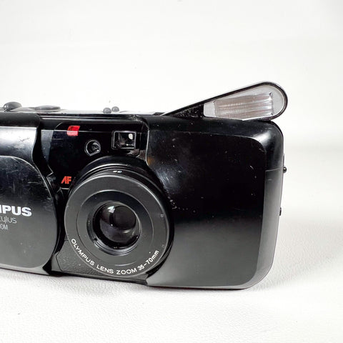 This camera features a 35–70mm Olympus zoom lens, active autofocus, automatic film advance and rewind, built-in flash with multiple modes, and a sliding clamshell cover that protects the lens when not in use. The camera powers on, zooms smoothly, fires the shutter, advances film correctly, and the flash operates properly. Body shows moderate cosmetic wear, typical for this series, but no cracks or functional issues.