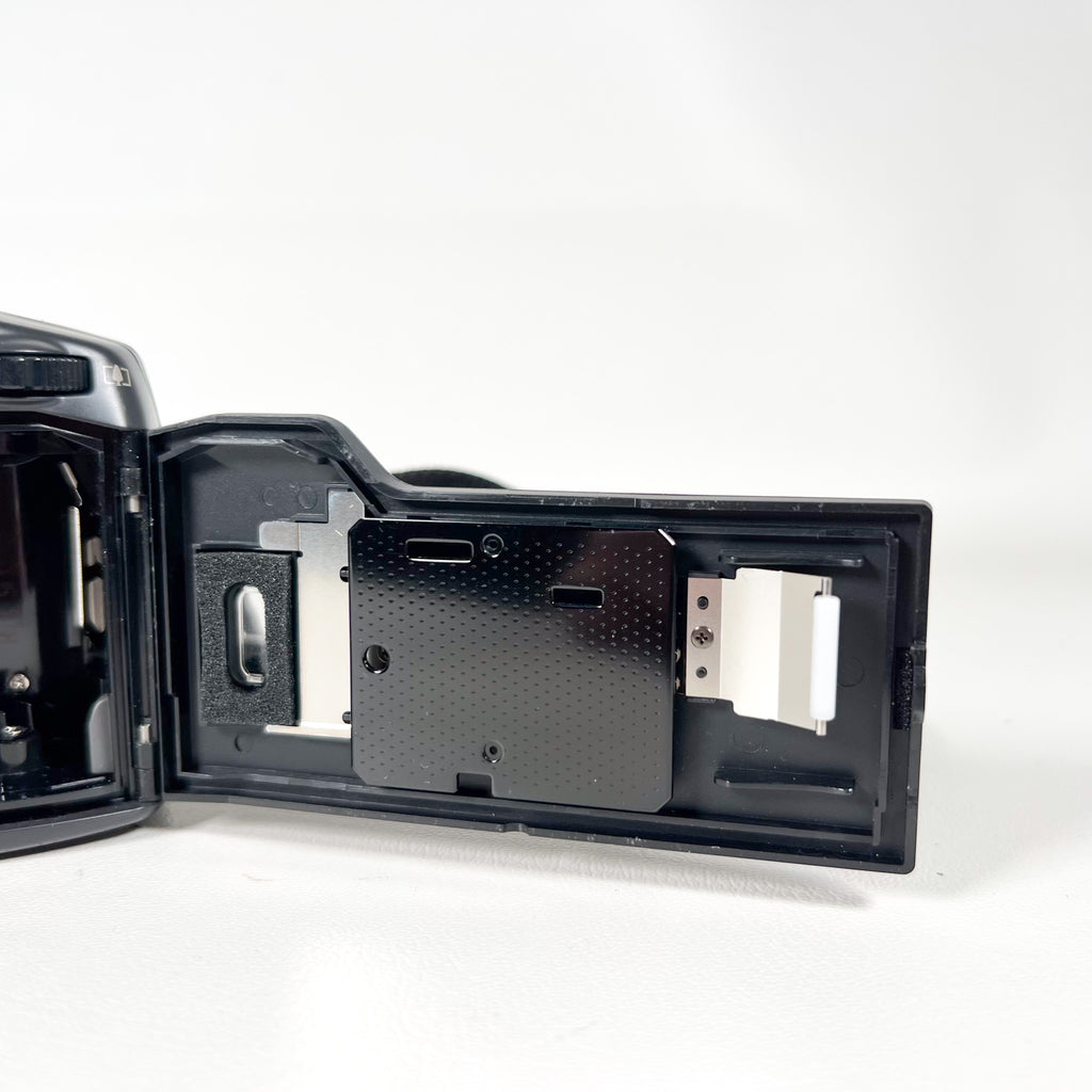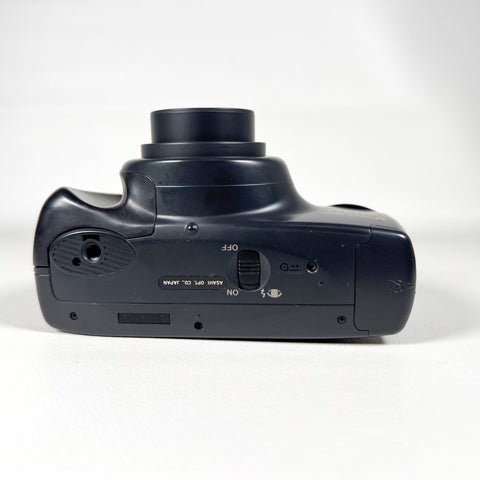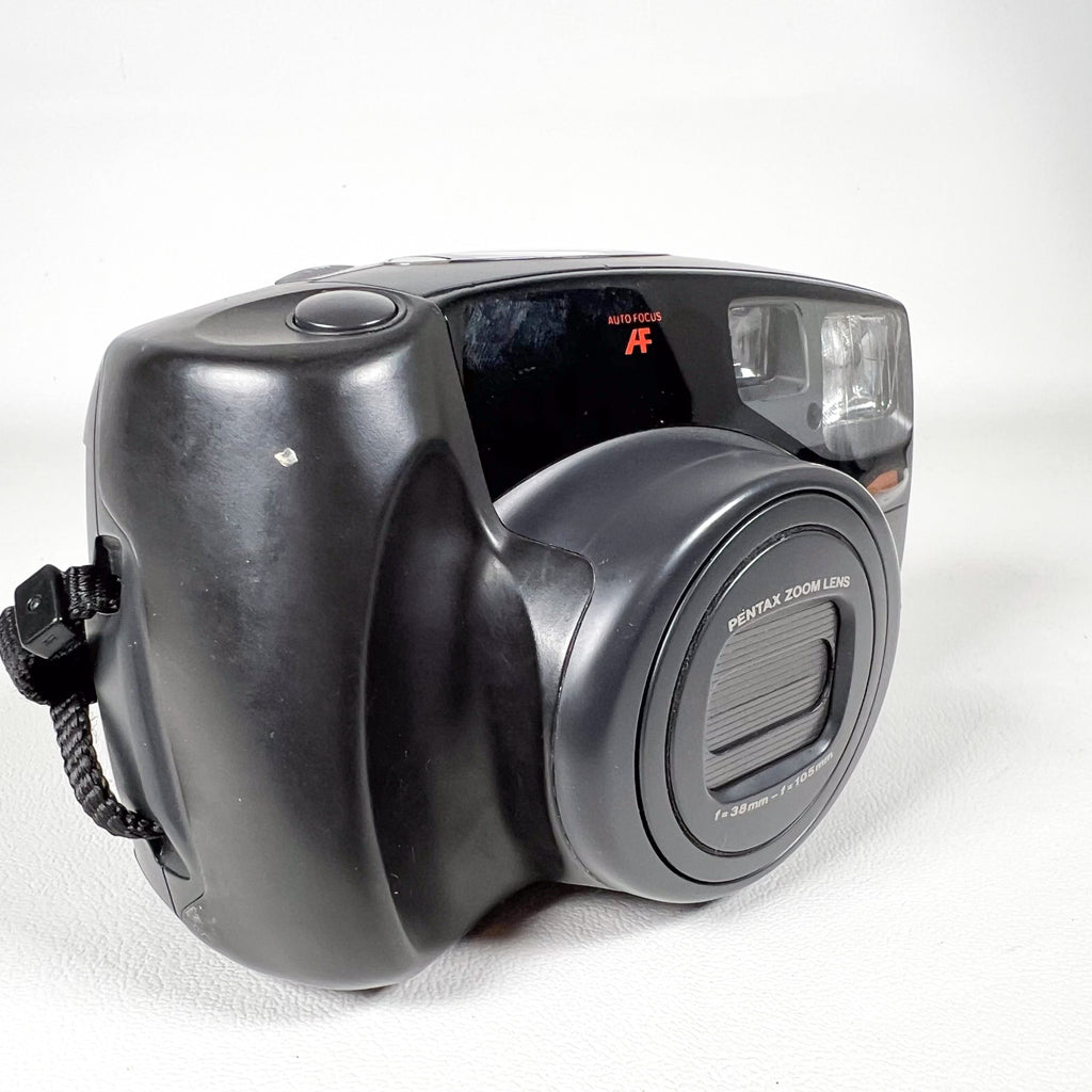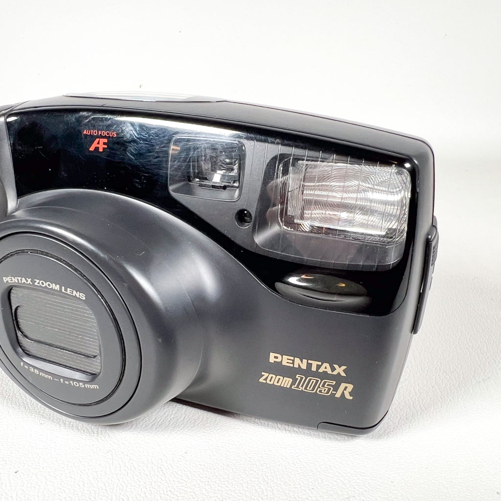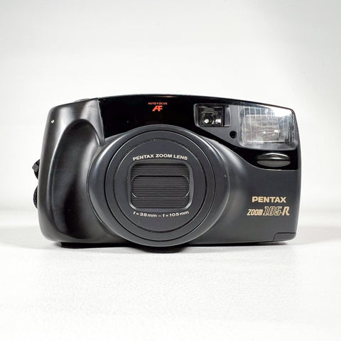 Tested and fully working Pentax Zoom 105-R from 1991, a popular mid-range point-and-shoot known for its reliable autofocus, sharp zoom lens, and intuitive controls. This model features a 38–105mm Pentax zoom lens, automatic film advance and rewind, multiple flash modes, self-timer, and a clear top LCD display for settings and focal length.