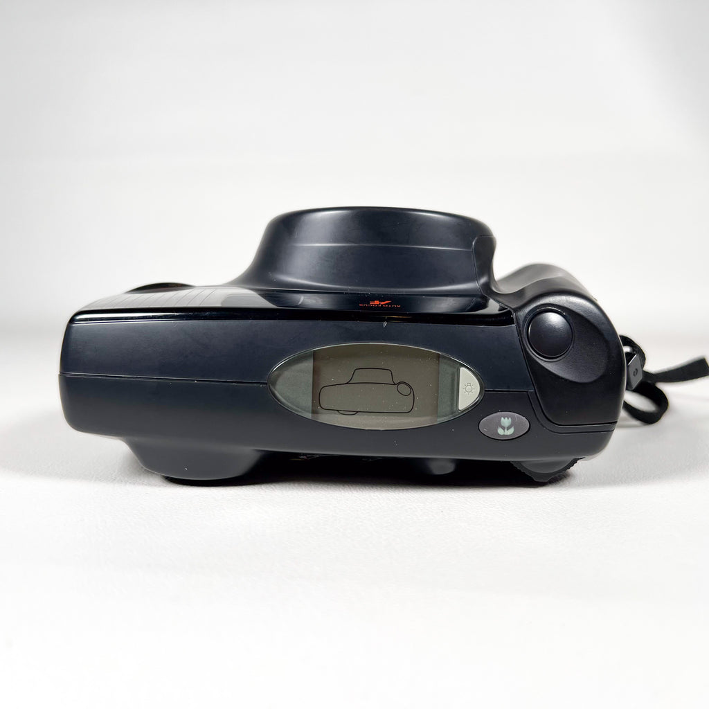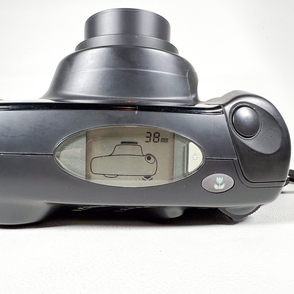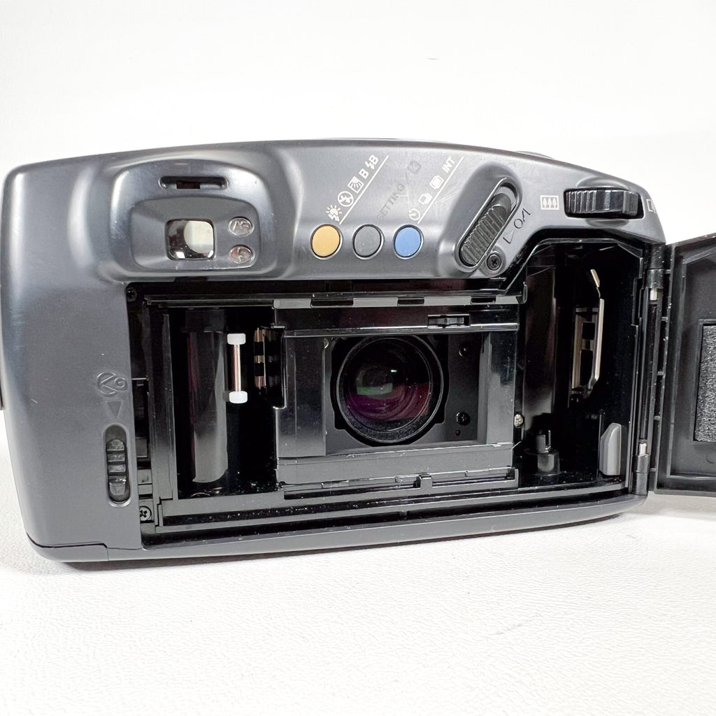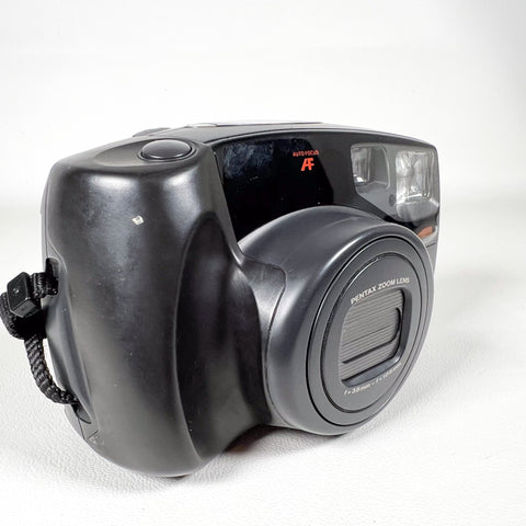 The camera powers on, zooms smoothly, fires the shutter, advances film, and the flash operates properly. LCD display is crisp and responsive. Body shows normal cosmetic wear from age but no cracks or damage. A clean, well-kept example of Pentax’s dependable 1990s zoom lineup.