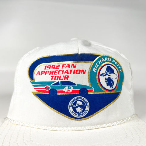 Authentic vintage 1992 Richard Petty Fan Appreciation Tour snapback hat featuring a bold front graphic with Petty’s iconic profile logo alongside the #43 race car. Classic NASCAR memorabilia piece with strong early 90s racing graphics and color blocking.
