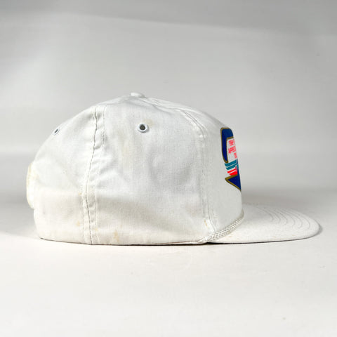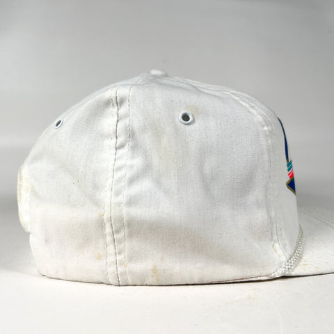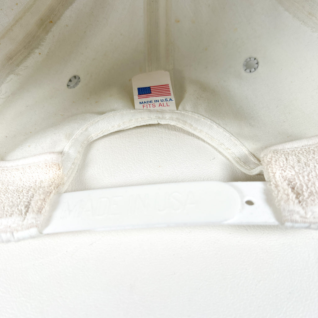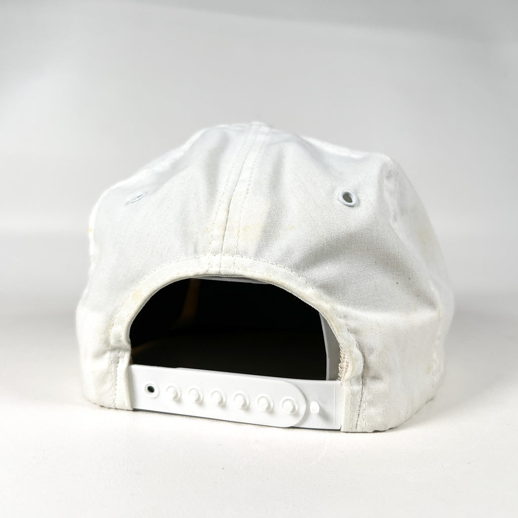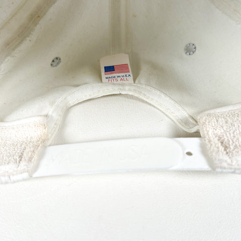 This hat is sold as-is with no returns or exchanges. Shows visible staining/discoloration throughout the white fabric, especially along the sides, back, and interior sweatband. Has not been deep cleaned or treated. Priced accordingly for condition and rarity. Please review all photos carefully.