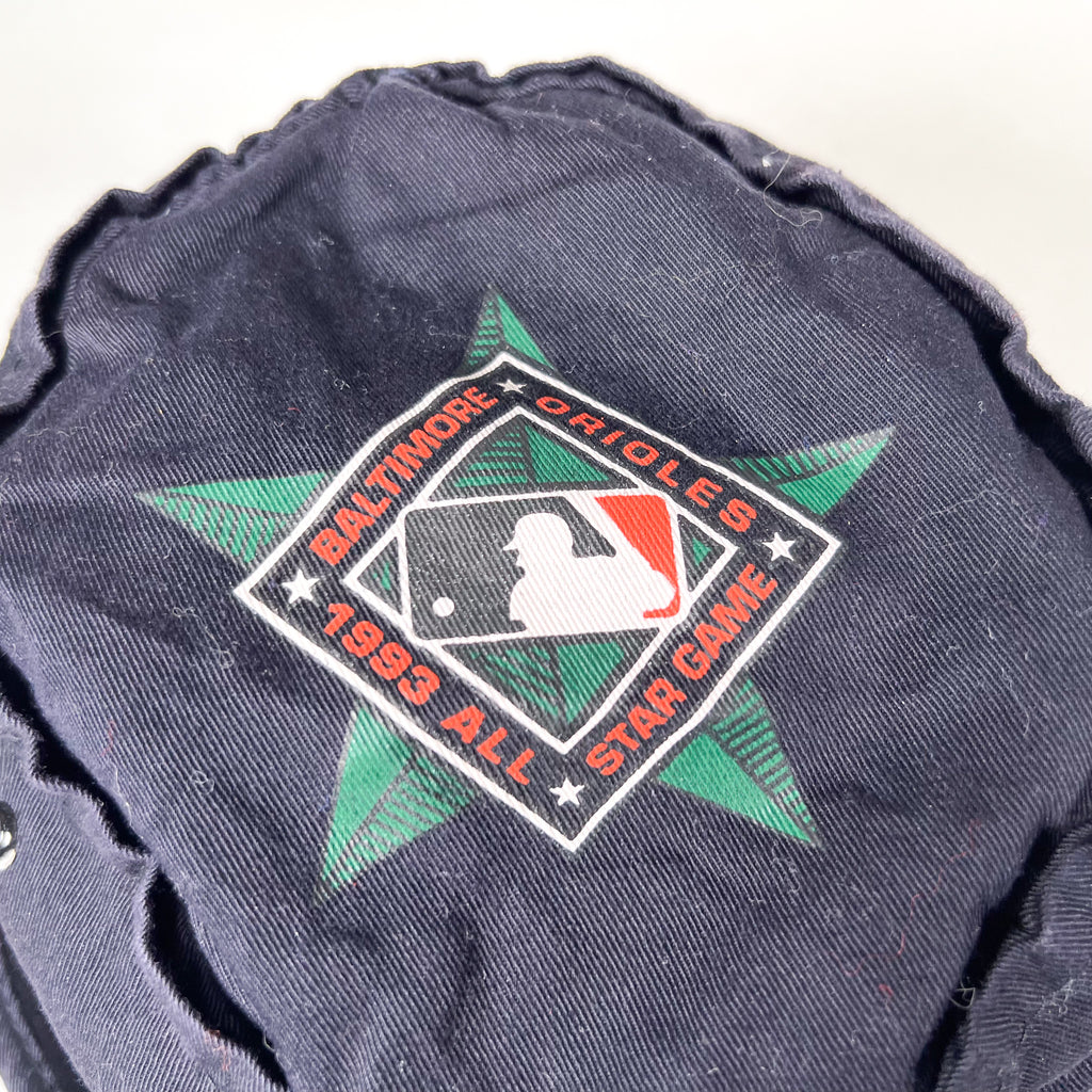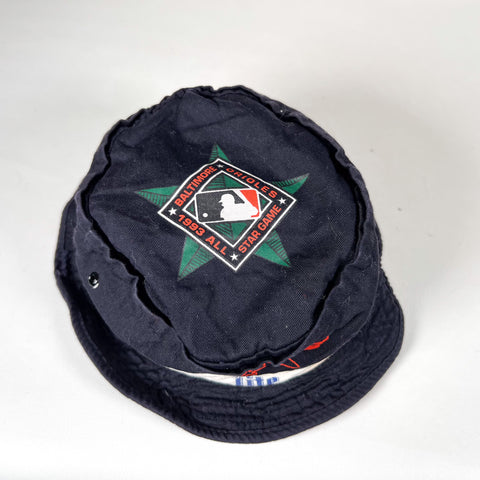True early-90s promo heat. Vintage 1993 Baltimore Orioles MLB All-Star Game bucket hat featuring Miller Lite branding around the band, Orioles bird graphic on the side, HTS graphic on the back, and the full 1993 All-Star Game logo on top. Classic navy cotton with a soft, well-worn feel.