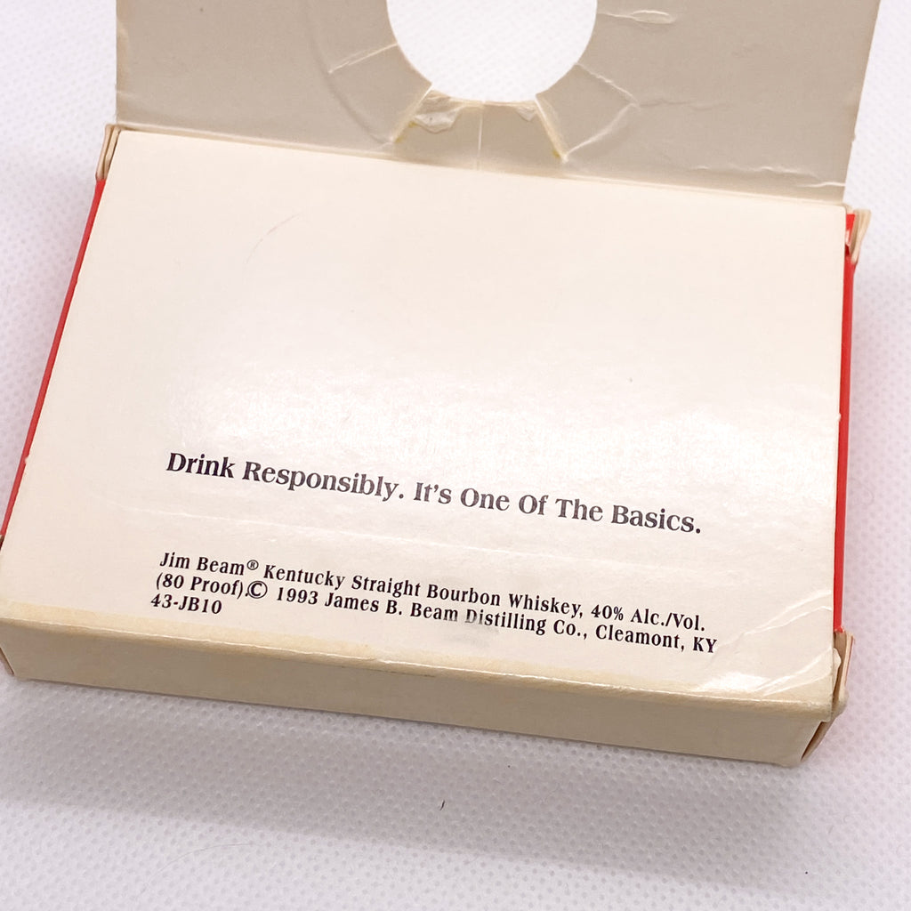 This is a vintage 1993 Jim Beam limited-edition belt buckle featuring a raised Jim Beam logo, the outline of North Carolina, and detailed sour-mash Kentucky Straight Bourbon Whiskey graphics. Heavy cast metal with an aged brass finish. Includes the original retail packaging, which shows creasing, cracks, and general wear from age.