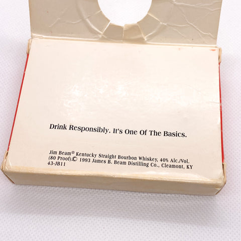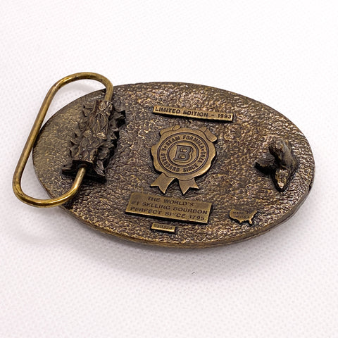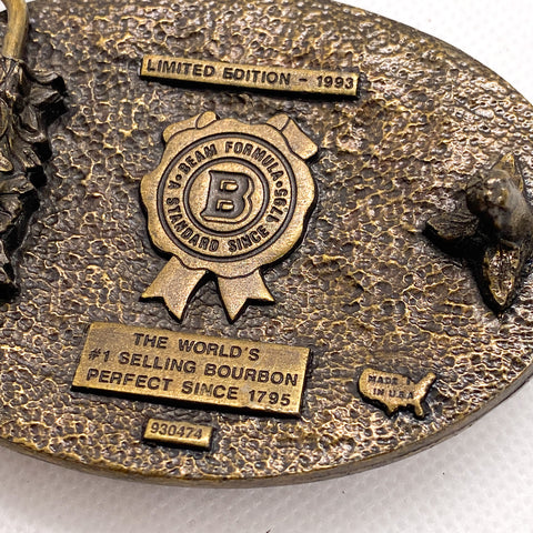 This is a vintage 1993 Jim Beam limited-edition belt buckle featuring a raised Jim Beam logo, the outline of Virginia, and classic sour mash Kentucky Straight Bourbon Whiskey detailing. Heavy cast metal with a weathered brass finish. Comes with its original display packaging, which shows age and creasing but remains intact.