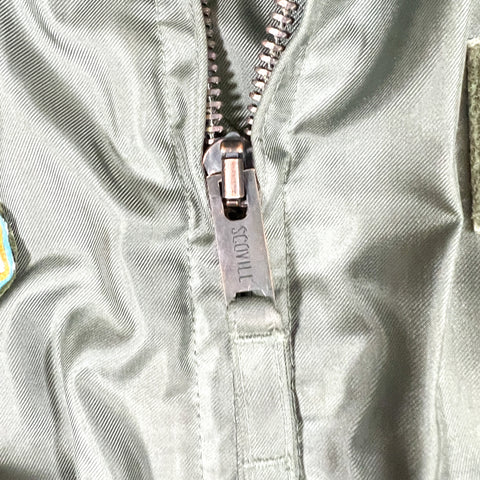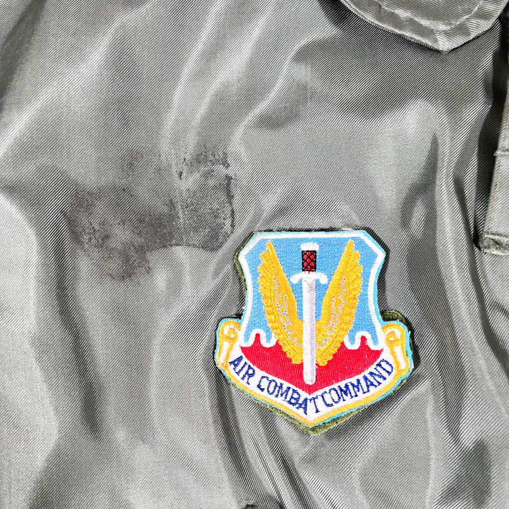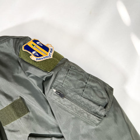 This particular jacket is adorned with original Air Combat Command, 314th Airlift Wing, and U.S. flag patches, each sewn onto its Velcro backing — a true representation of active service use. The jacket features a Scovill USA zipper, Velcro nameplate area, storm flap, and MA-2 utility pocket on the sleeve.