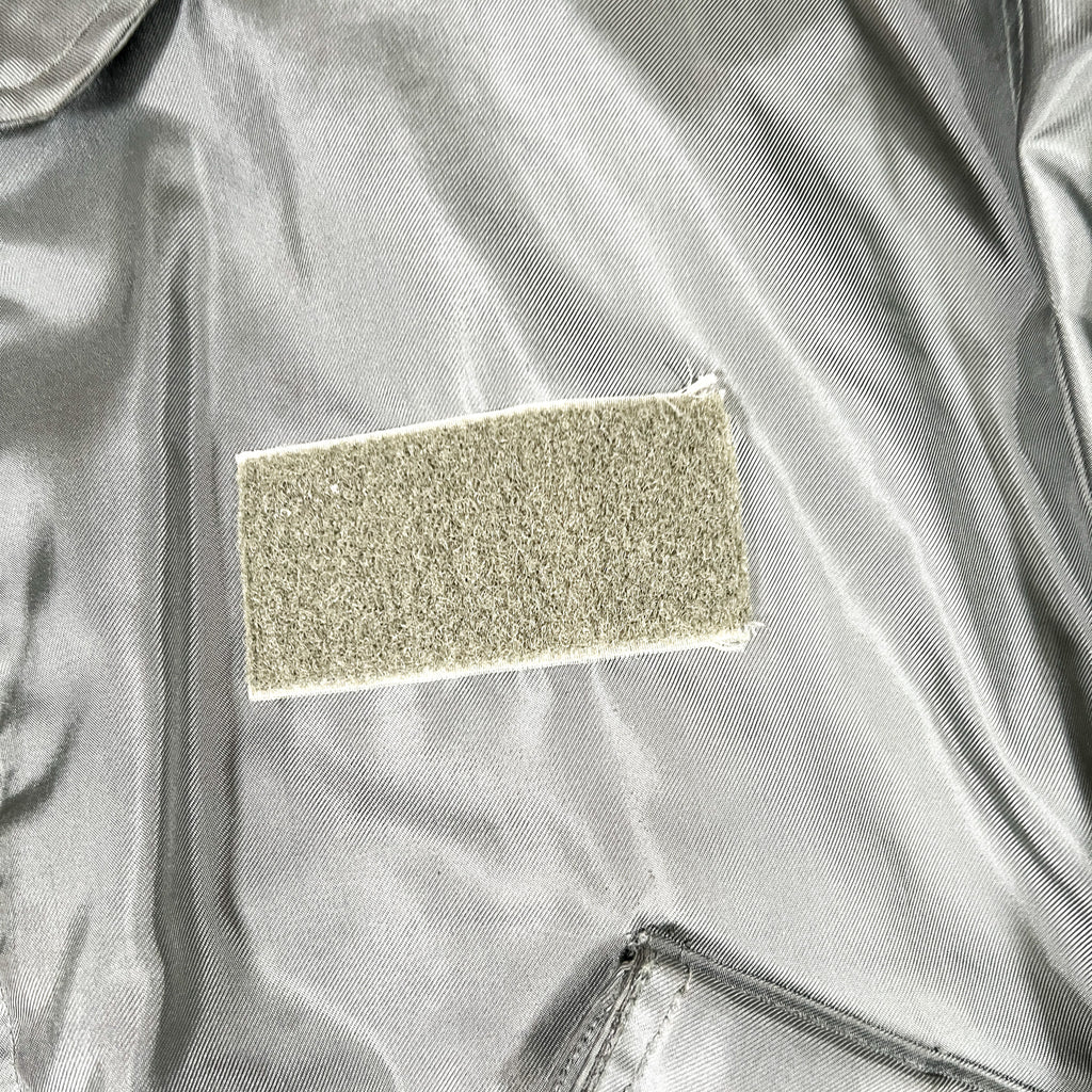 Sold as-is. Structurally sound and wearable, but with visible patch shadowing and marks on the chest from prior insignia. Knit cuffs and waistband show light wear consistent with age.