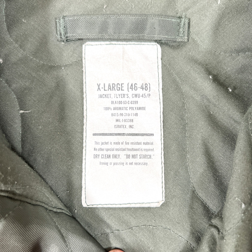 Authentic U.S. Air Force CWU-45/P Nomex Flight Jacket, issued in 1993 and manufactured by Isratex, Inc. — one of the original Department of Defense contractors for the CWU series. This heavyweight version of the flight jacket was designed for cold-weather aircrew use, constructed from 100% aromatic polyamide (Nomex) for superior fire resistance and durability.