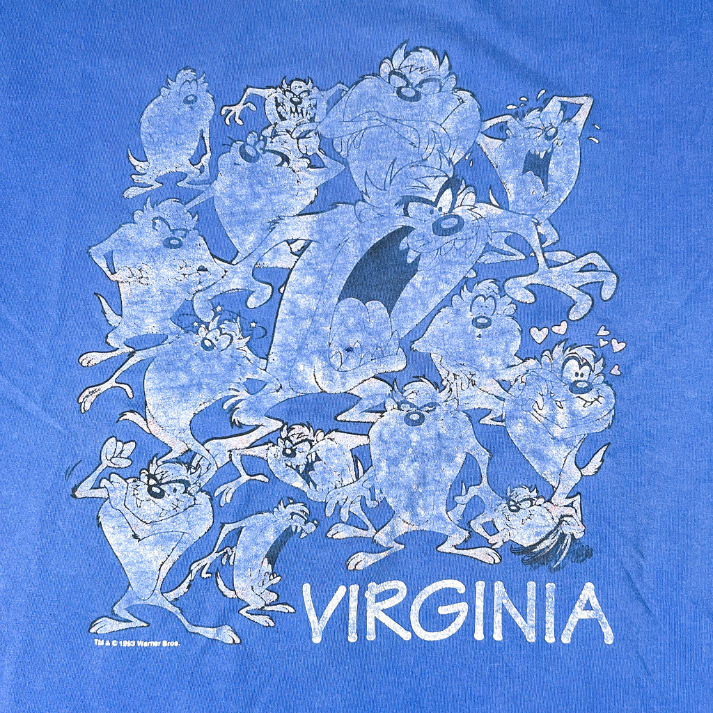 Vintage 1993 Warner Bros Taz “Virginia” graphic tee printed on a royal blue Velva Sheen blank — Made in USA. Features a playful all-over print of the Tasmanian Devil in multiple poses surrounding bold “VIRGINIA” text.