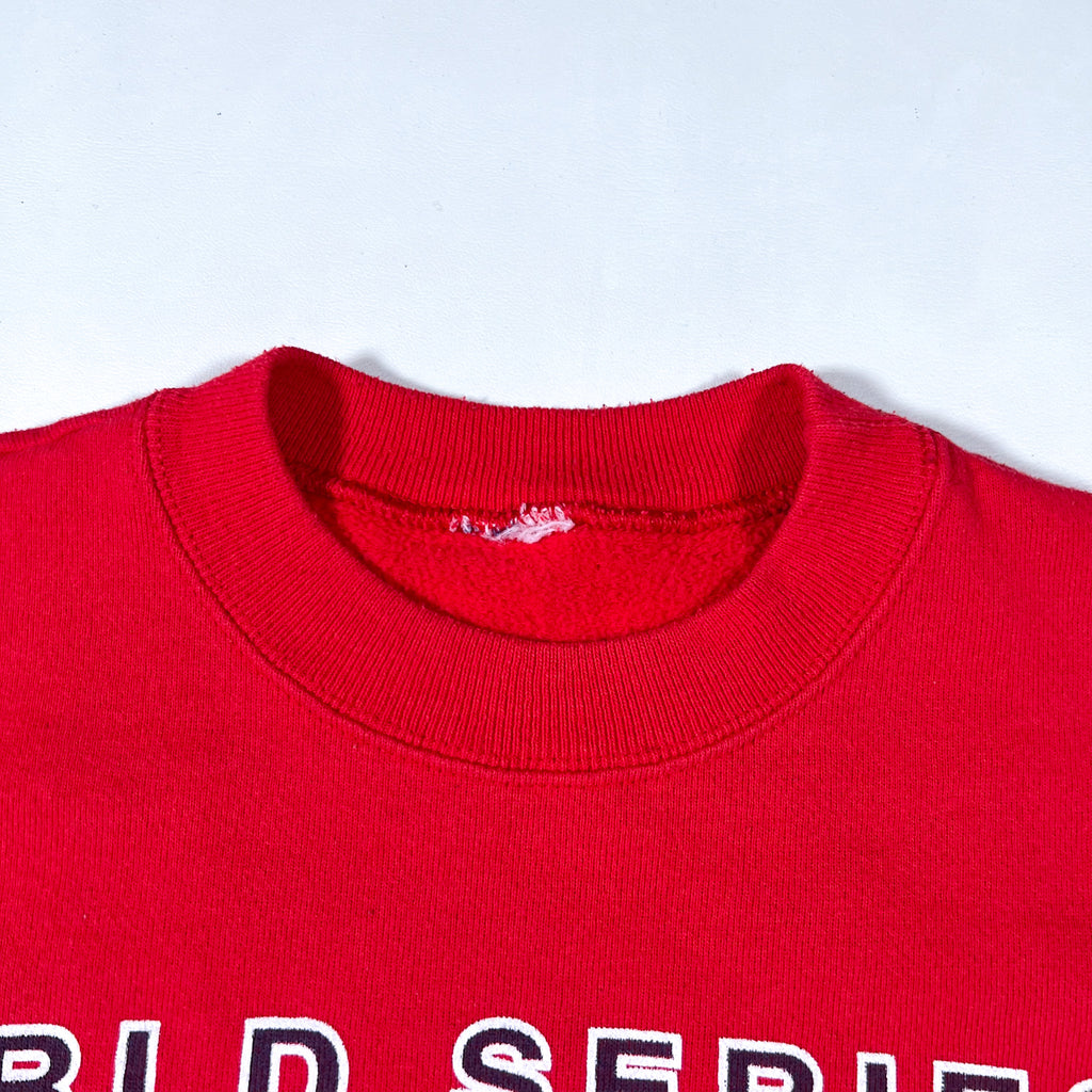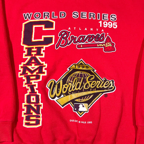Vintage 1995 Atlanta Braves World Series Champions crewneck in a bold bright red with huge front graphics celebrating their historic win. Features the classic Braves script logo, World Series emblem, and vertical “CHAMPIONS” lettering down the left side. Officially licensed MLB piece dated 1995 at the print.