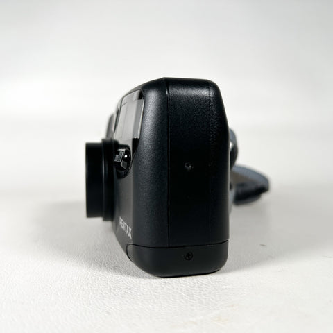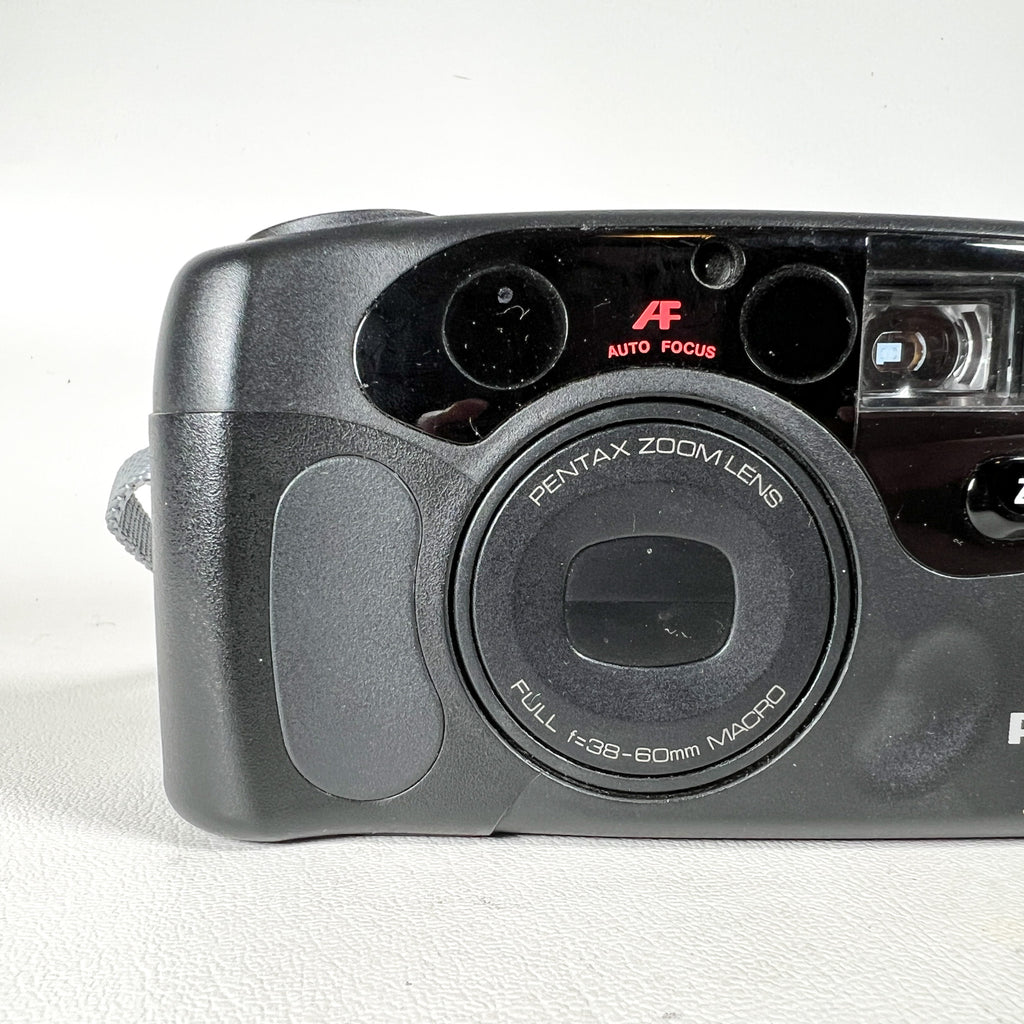 Equipped with a Pentax 38–60mm zoom lens, this camera covers wide to short telephoto, with macro capability for closer subjects — adding flexibility beyond standard point-and-shoot models.