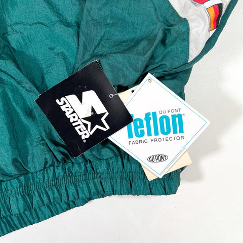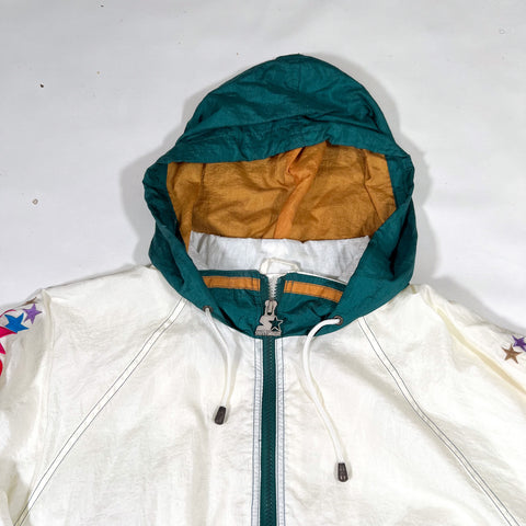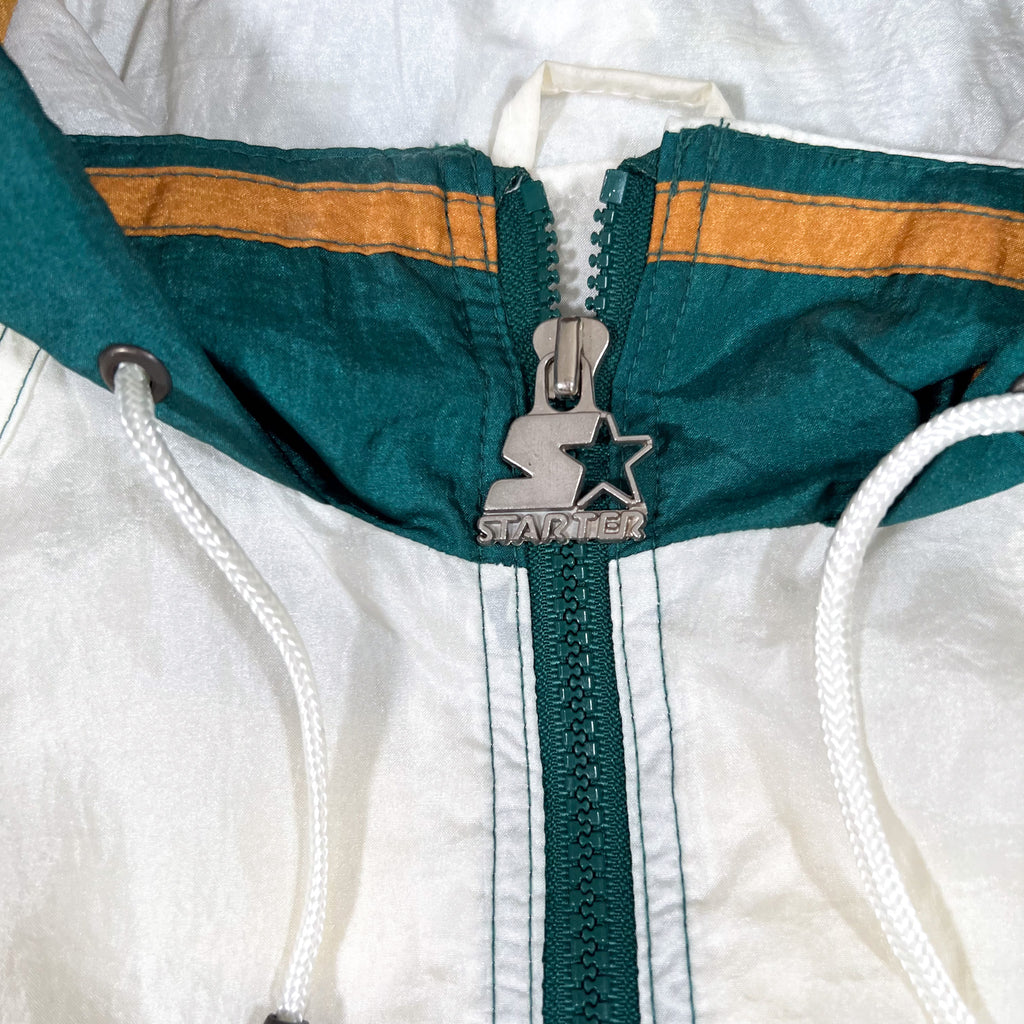 Constructed from Teflon-coated DuPont nylon for water resistance, this pullover includes a half-zip front with the iconic metal Starter zipper pull, kangaroo pocket, drawstring hood, and elastic cuffs and hem. A true collector’s item from the centennial Olympic Games, made in Korea.