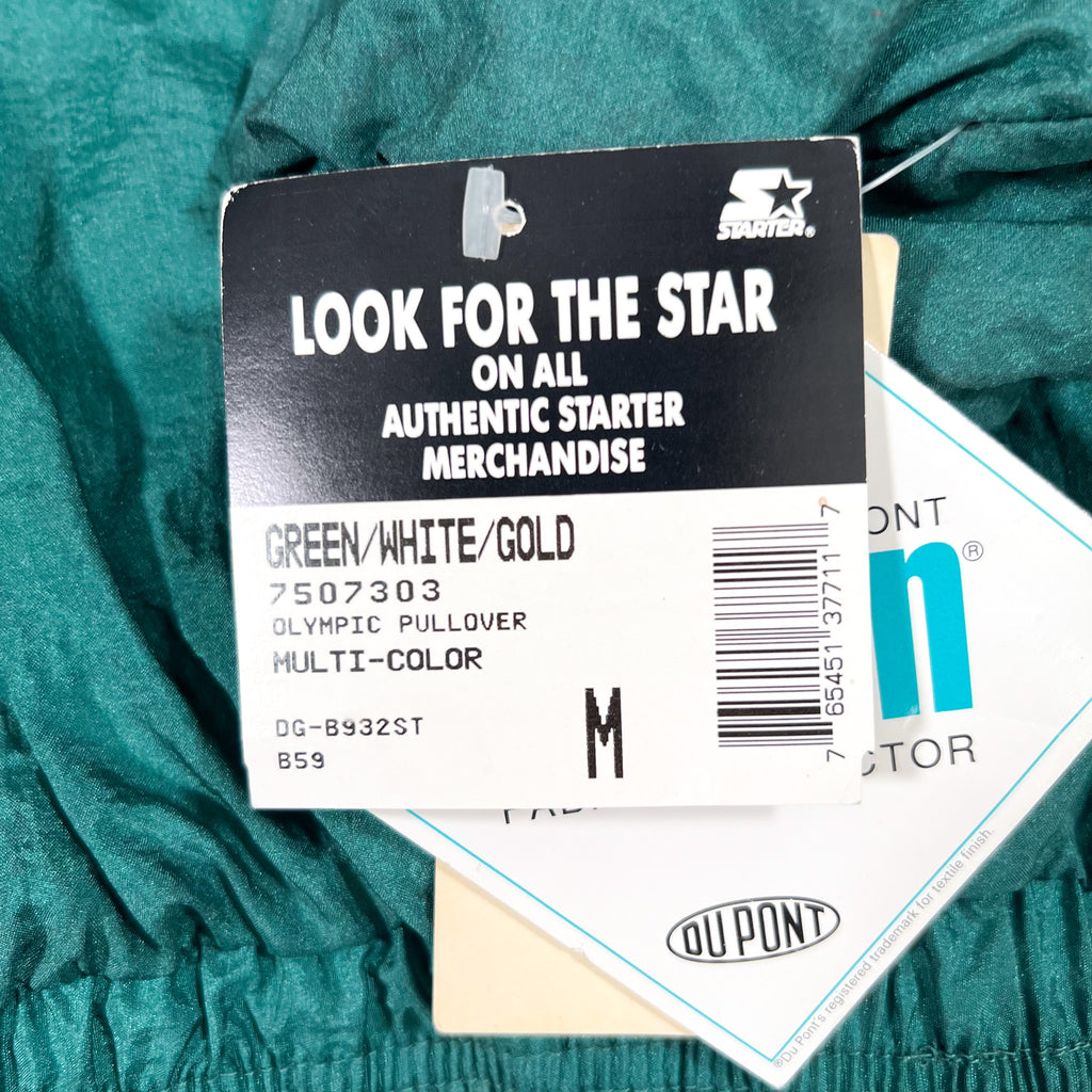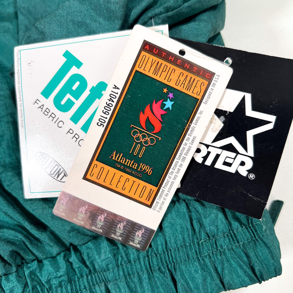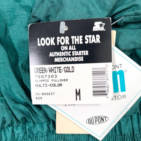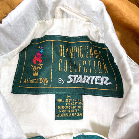 Incredible deadstock piece from the 1996 Atlanta Olympic Games Collection by Starter, featuring original tags still attached. This authentic Olympic pullover showcases a striking green, white, and gold colorway with full flag trim detailing and bold embroidered Olympic torch logos on both sleeves.