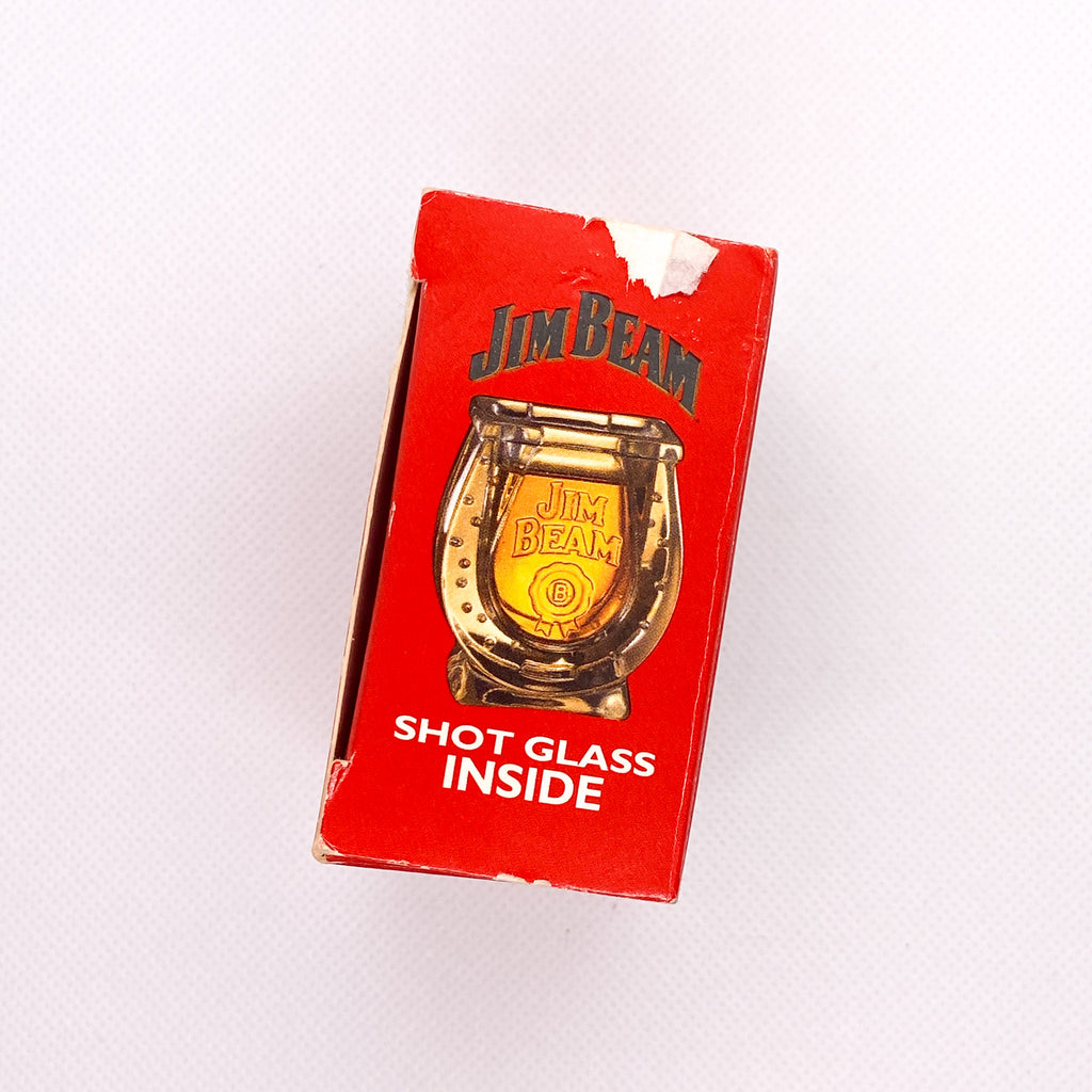 This is a vintage Jim Beam promotional shot glass from 1996, designed in the shape of a horseshoe for a fun good-luck twist. Made of thick embossed glass with “Jim Beam” branding on the front, this piece was originally released as a boxed bar collectible and still includes the original packaging.