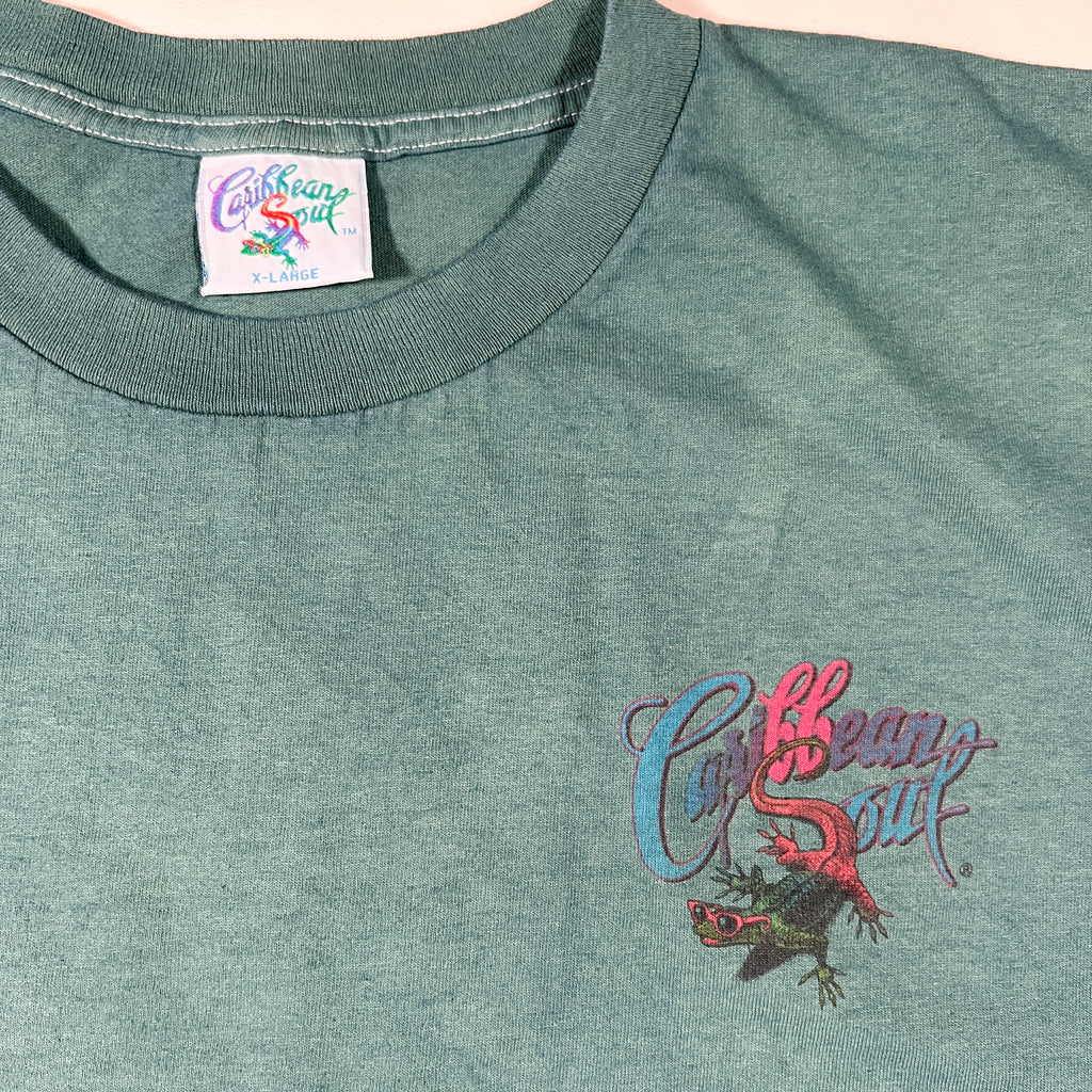 Authentic vintage 1997 Caribbean Soul graphic T-shirt featuring a bold full-back pirate parrot illustration with nautical details and “Parrot Looks at Yo” artwork. This tee has a classic late-90s beachwear / resort souvenir vibe with a smaller chest hit on the front and a large, colorful back graphic.