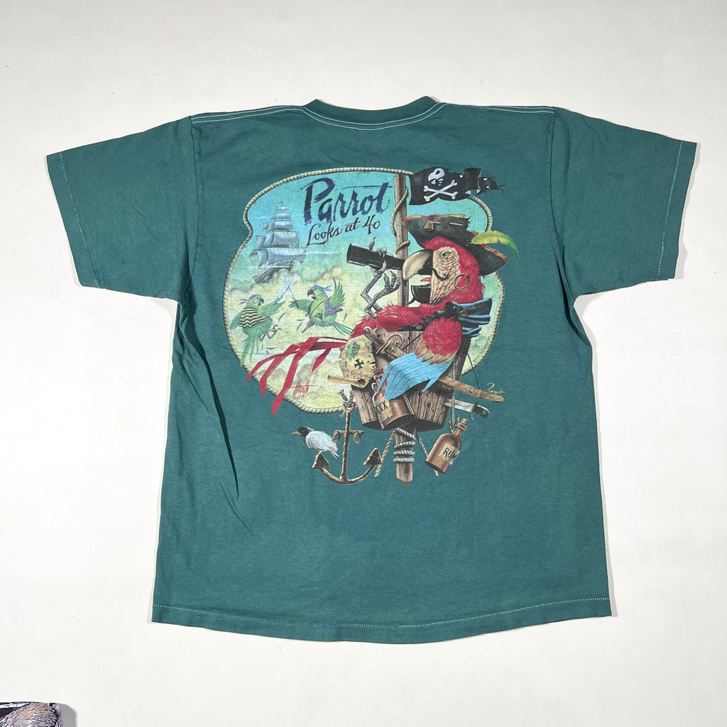 This shirt was originally white and has been hand-dyed by me to a green/teal tone, giving it a one-of-one custom look. The dye job adds character and depth, and subtle variation in tone should be expected. Perfect for collectors of 90s novelty graphics, parrot / pirate imagery, or anyone into loud back-print tees. We suggest you wash this shirt with like colors.