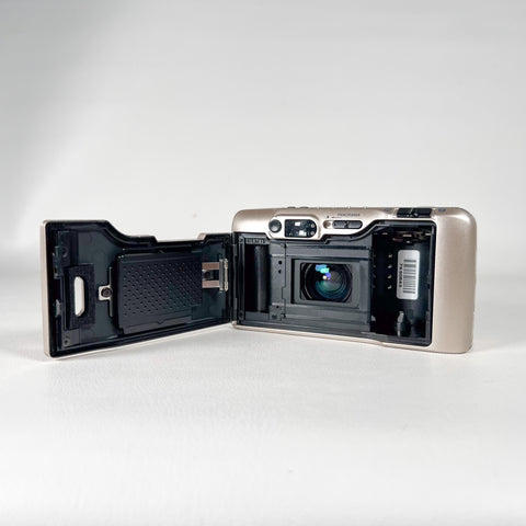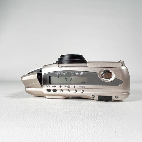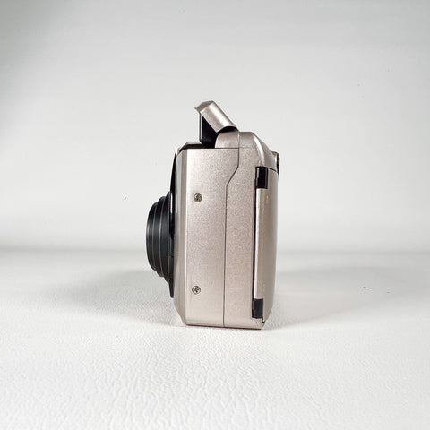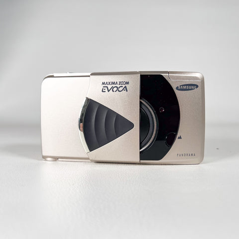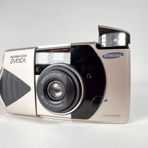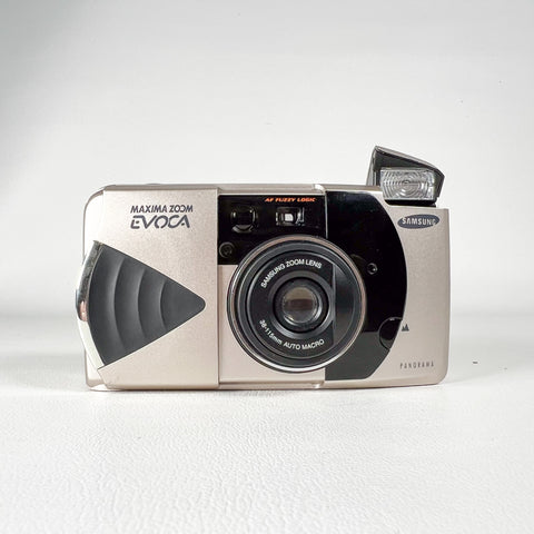 A sleek late-90s compact, the Samsung Maxima Zoom Evoca blends a futuristic design with surprisingly strong features for everyday 35mm photography. It includes Samsung’s “AF Fuzzy Logic” autofocus system, a versatile 38–115mm zoom lens, auto macro capability, panorama switch, and a top LCD with multiple shooting modes.