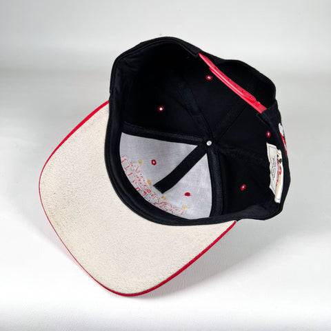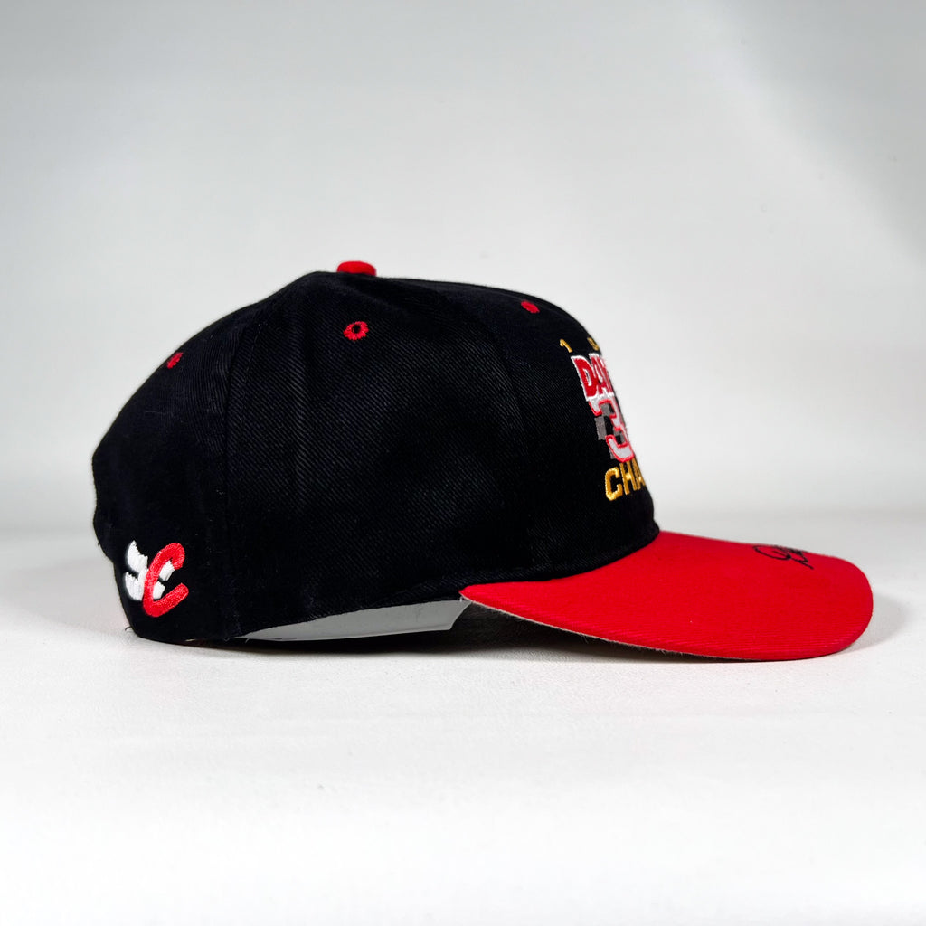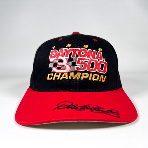 Vintage 1998 Daytona 500 Champion snapback hat featuring bold raised front embroidery and embroidered Dale Earnhardt signature across the brim. Black crown with red bill, red eyelets, and matching red snapback closure. Official NASCAR Chase Authentics tag. A must-have for Earnhardt fans, NASCAR history collectors, or anyone who loves authentic late-90s racing merch.