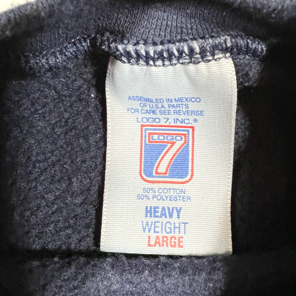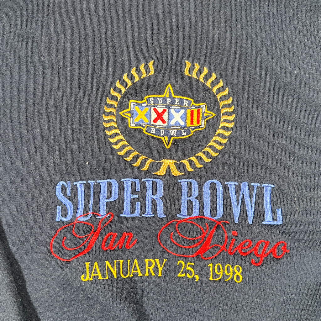 Authentic vintage Super Bowl XXXII crewneck sweatshirt from 1998 featuring embroidered graphics for Super Bowl XXXII in San Diego (January 25, 1998). Classic late 90s NFL event piece with bold multicolor embroidery and a heavyweight fleece construction. Made on a Logo 7 heavy weight blank, known for durable fabric and a boxy vintage fit.