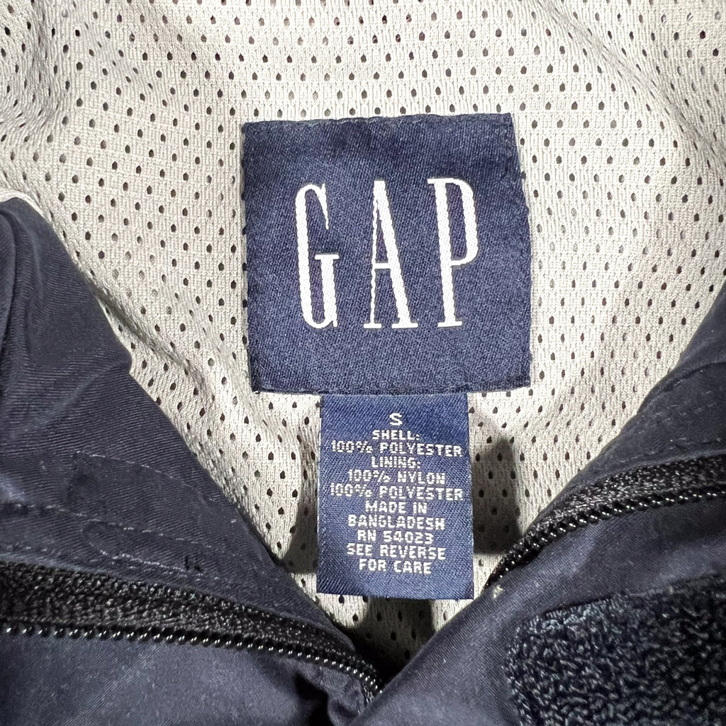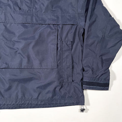 Clean late-90s GAP pullover anorak in classic navy. Features a mesh-lined hood, half-zip front, velcro cuffs, front kangaroo pocket with flap, and adjustable hem cinch. Timeless minimalist GAP outerwear from the era when their technical pieces were built tough. Tagged Small but fits like a modern Adult Large based on measurements.
