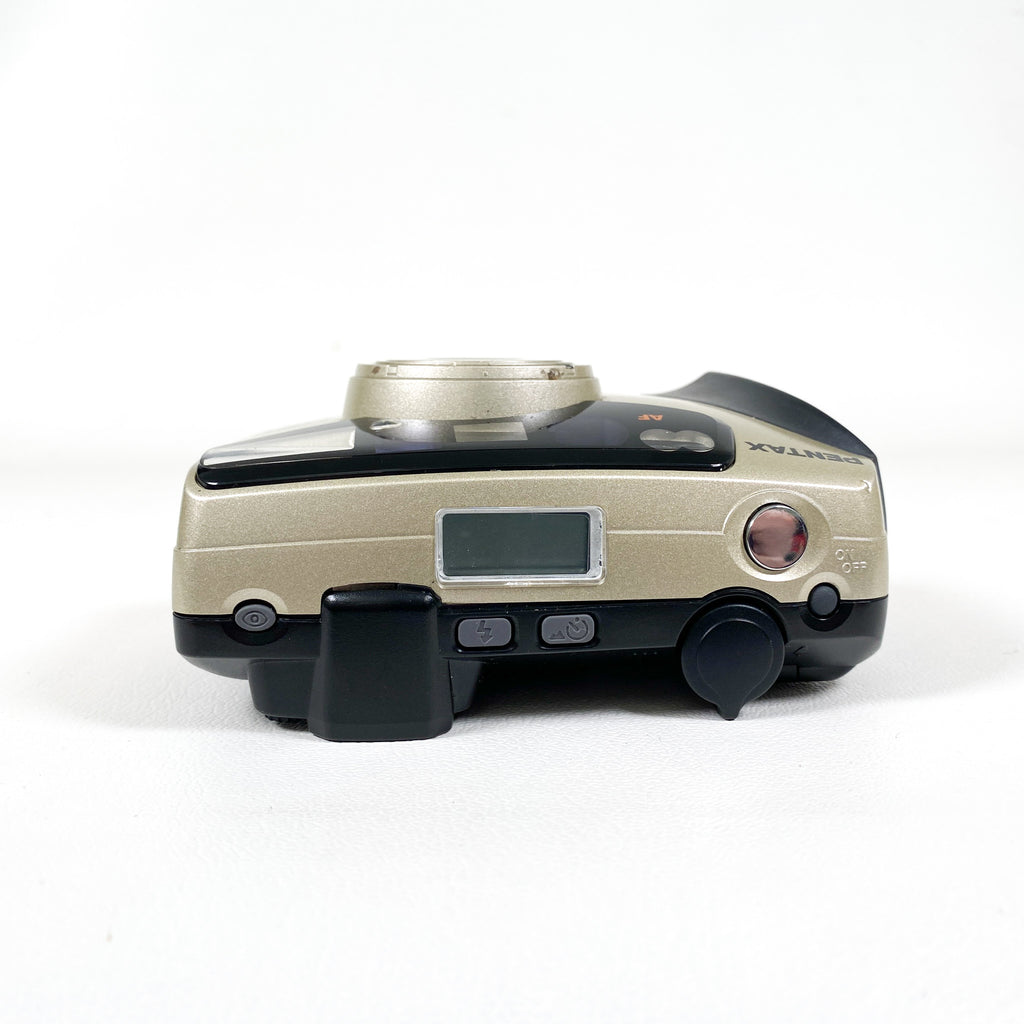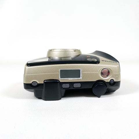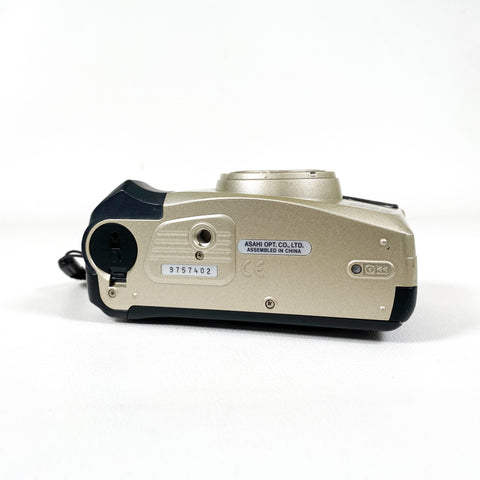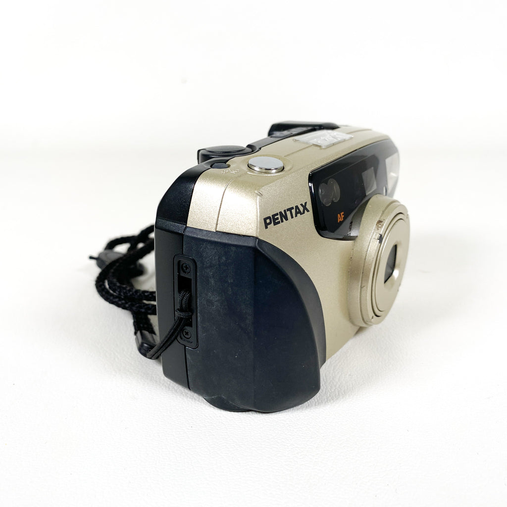 Compact, stylish, and dependable — the Pentax IQZoom 105G is a late-1990s 35mm point-and-shoot film camera released in 1999. Known for its sharp optics and user-friendly design, it features a 38–105mm zoom lens, built-in flash with multiple modes, autofocus, and automatic film advance and rewind. Its ergonomic grip and sleek champagne-gold finish make it both comfortable and visually appealing.