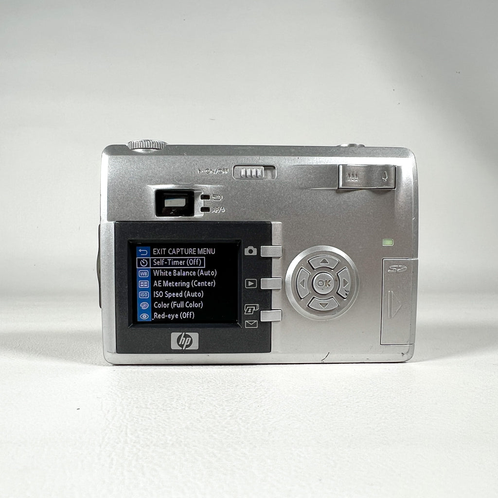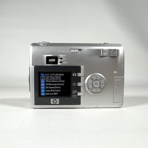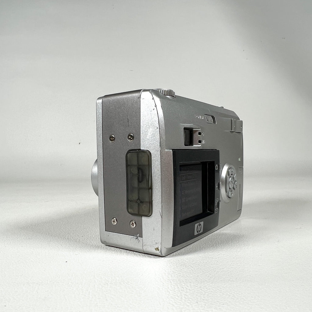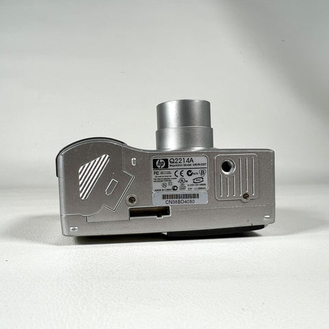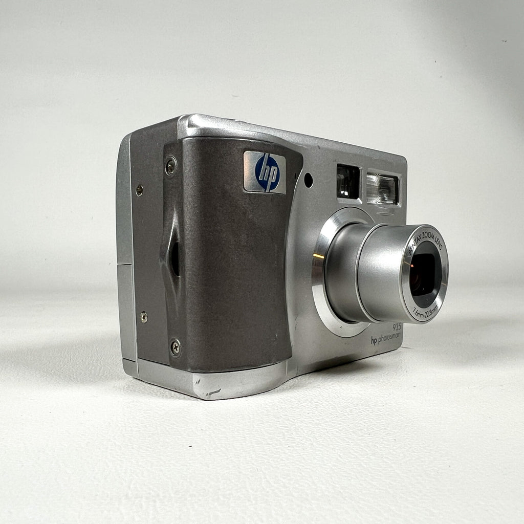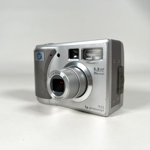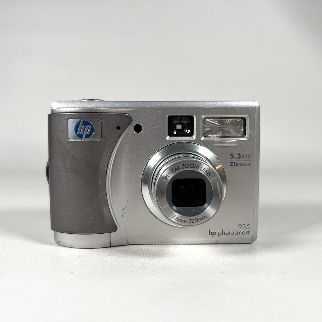 HP Photosmart 935 digital camera, HP 5.3MP camera, early 2000s digital camera, Y2K digital camera, Pentax zoom lens HP camera, vintage digital point and shoot, CCD sensor camera, AA battery digital camera, silver compact digital camera