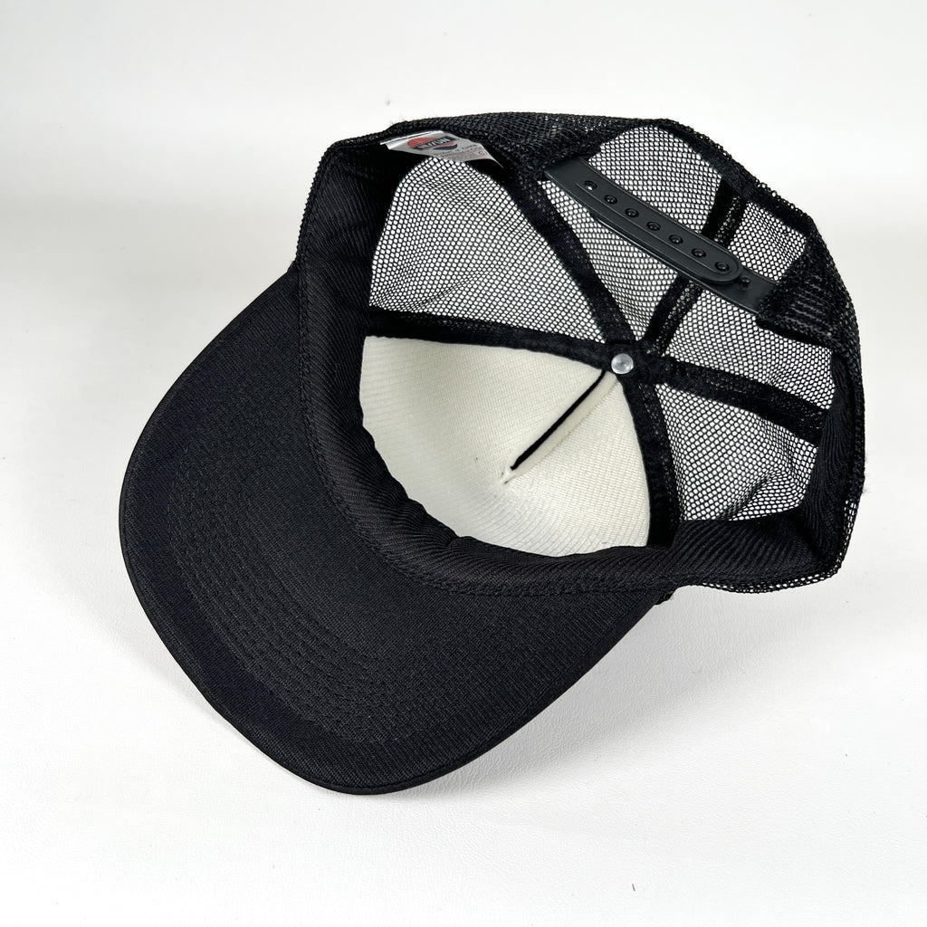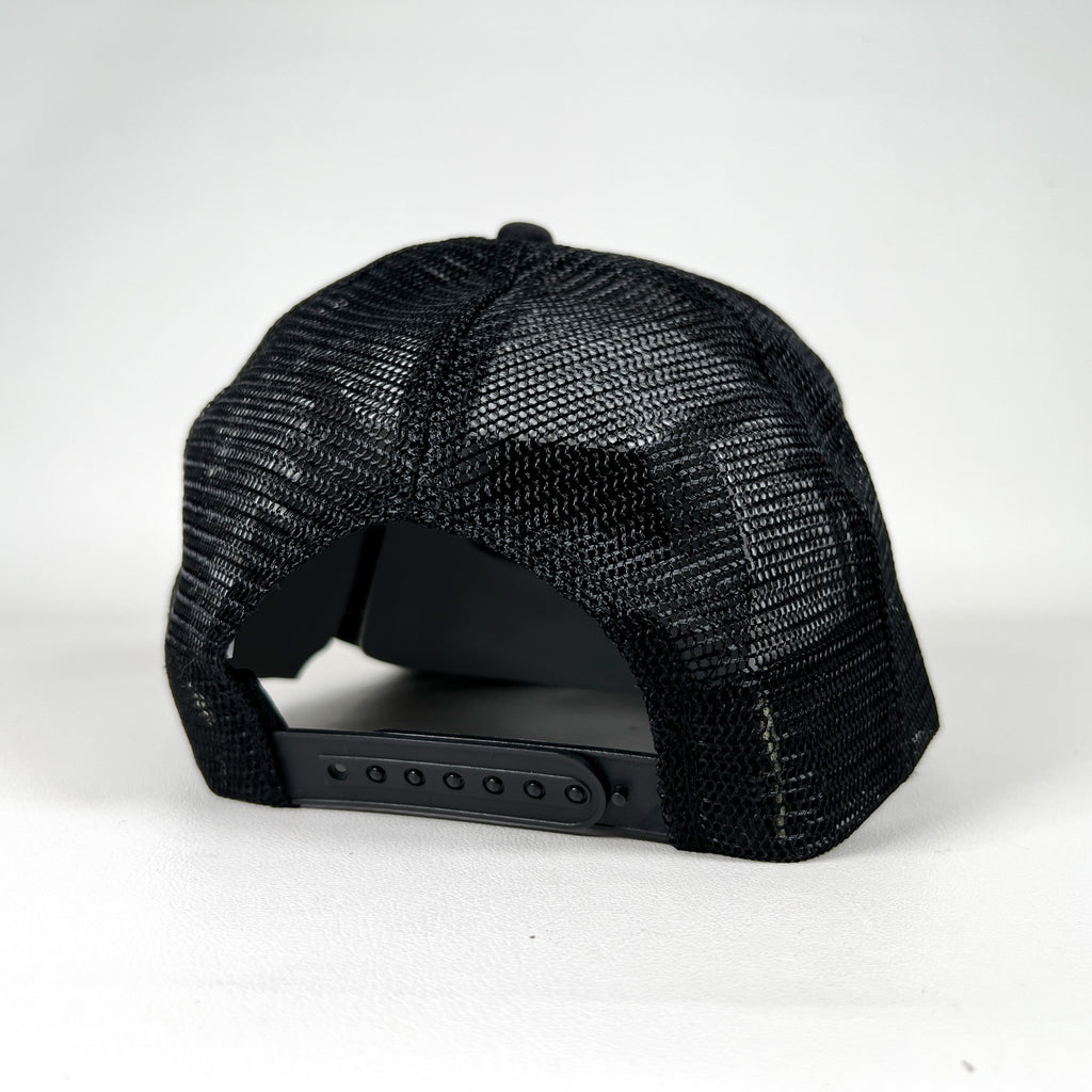 Black foam front with black mesh back and rope detail on brim