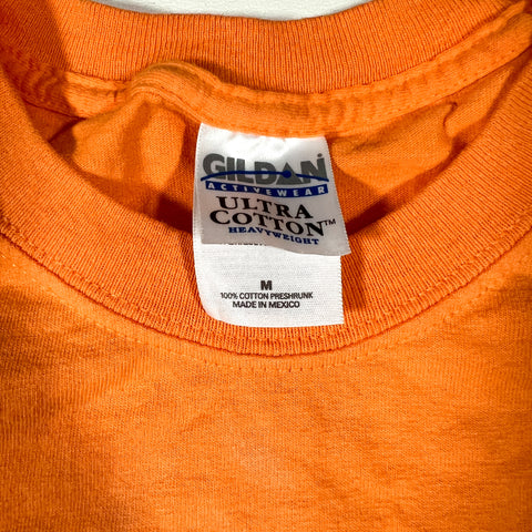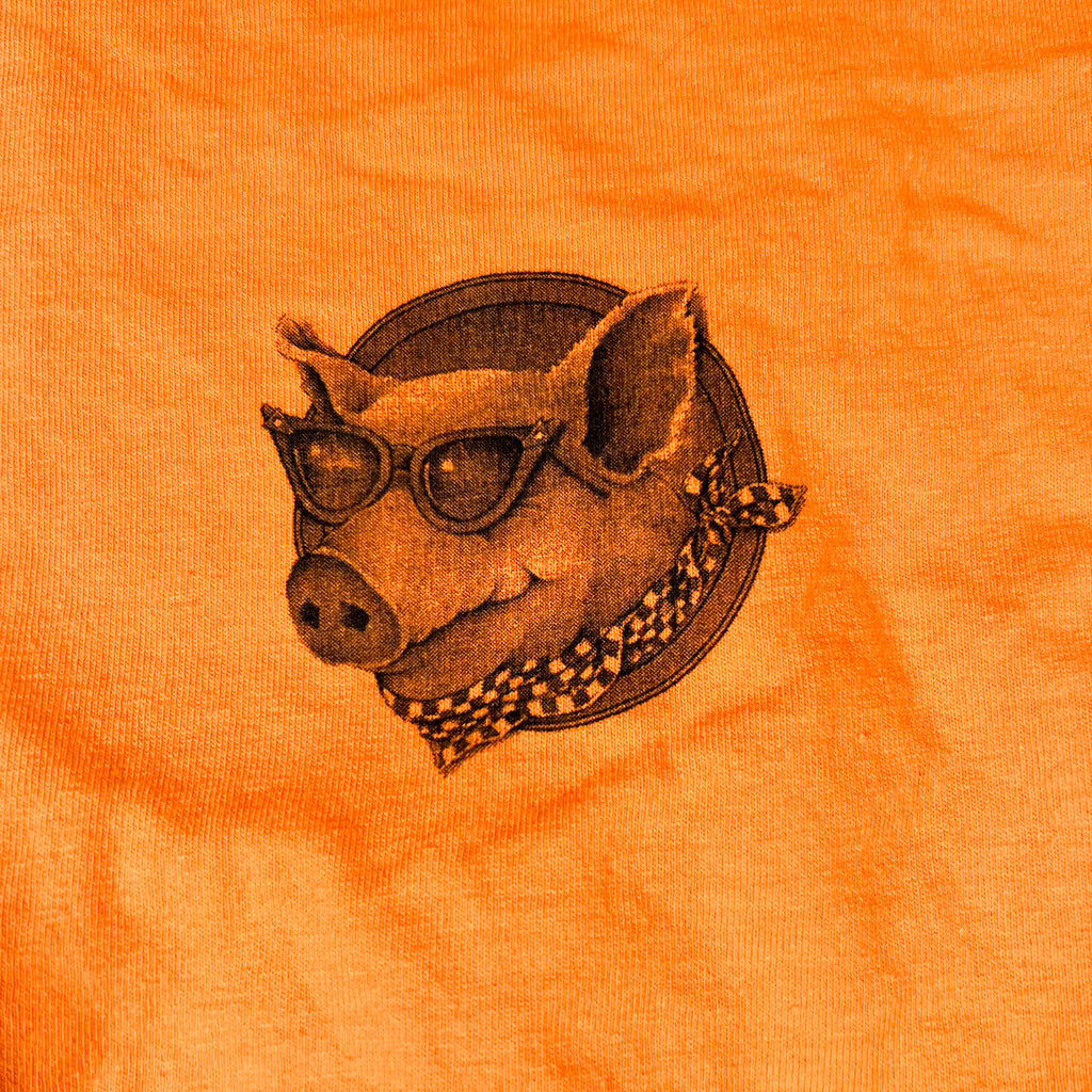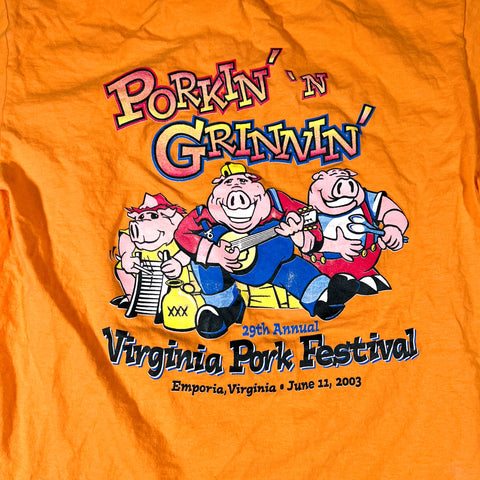 Bright, bold, and full of Southern charm — this 2003 Virginia Pork Festival tee is a slice of Americana worth savoring. Printed on an orange Gildan Ultra Cotton blank, the front features a cool pig logo wearing shades and a checkered bandana, while the back bursts with full-color artwork of three musical pigs “Porkin’ ’N Grinnin’” at Emporia’s legendary BBQ celebration.