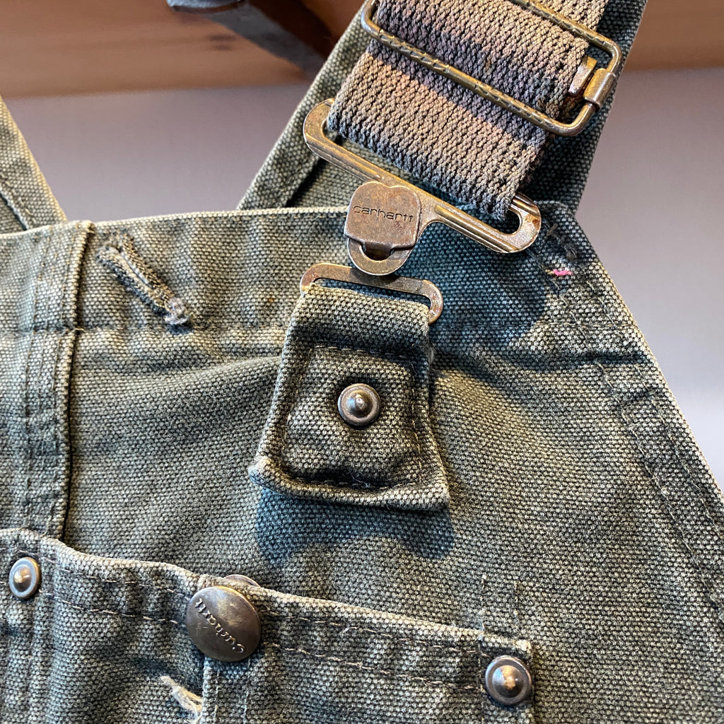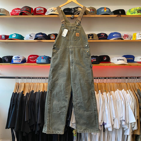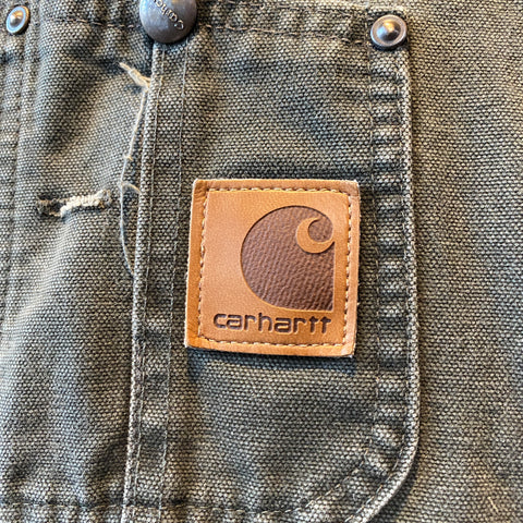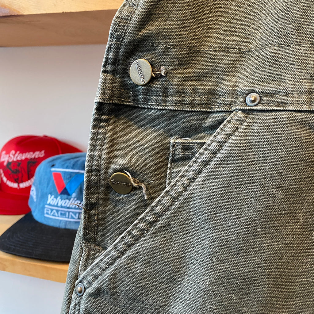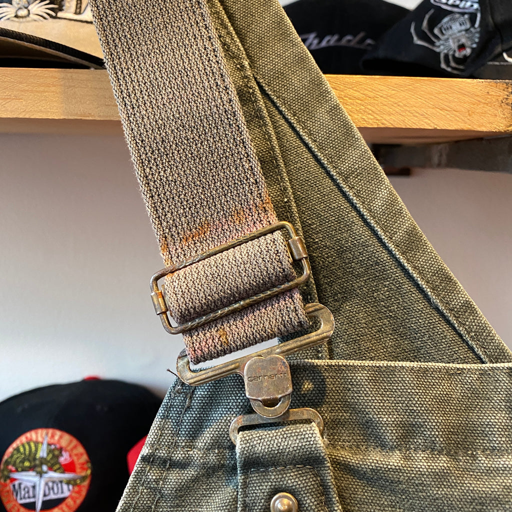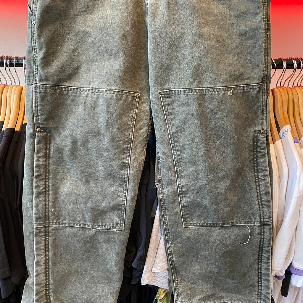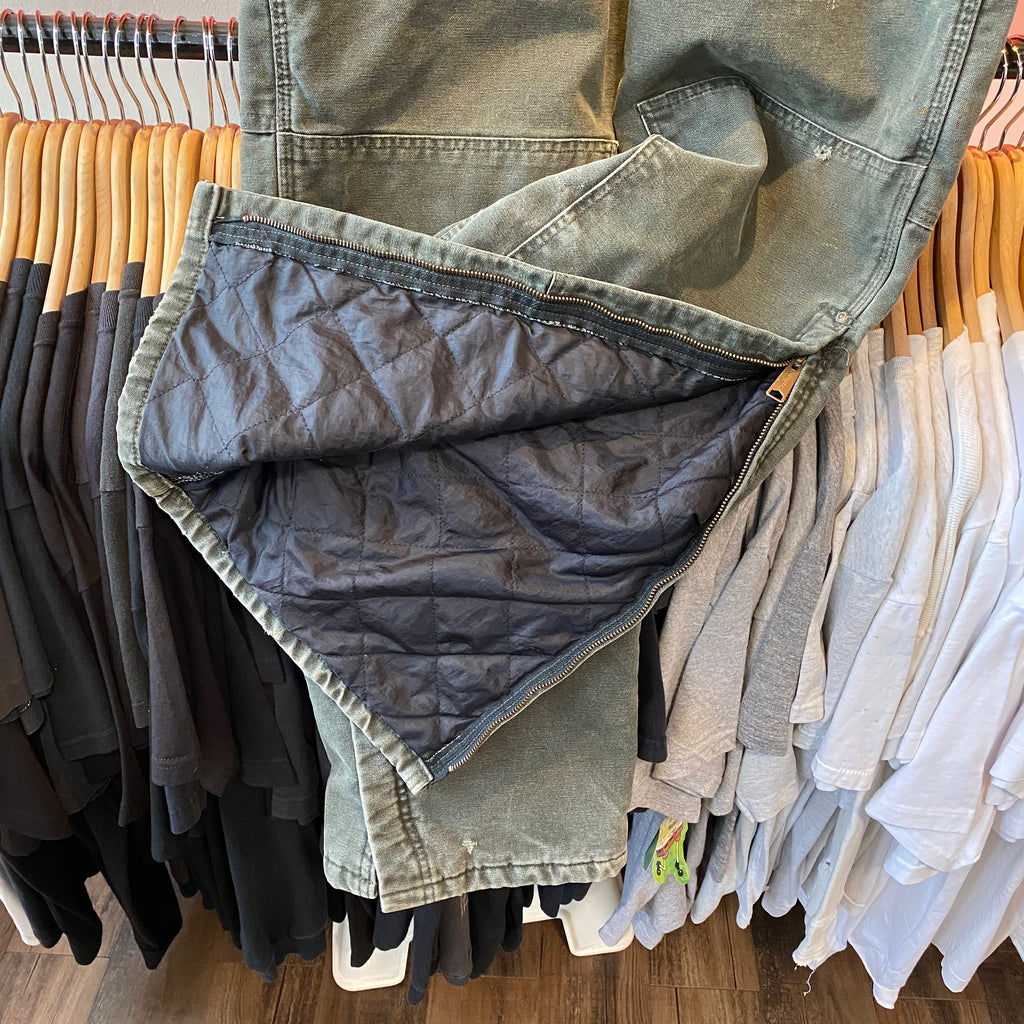 Authentic vintage Carhartt R27 insulated bib overalls in the sought-after MOS (Moss Green) colorway from 2004. Classic heavyweight cotton duck construction with quilted nylon lining for warmth, adjustable shoulder straps with Carhartt-branded hardware, reinforced knees, multiple utility pockets, and full-length leg zips for easy on/off over boots. This pair shows natural wear and light distressing throughout, adding great character and patina consistent with age and use.