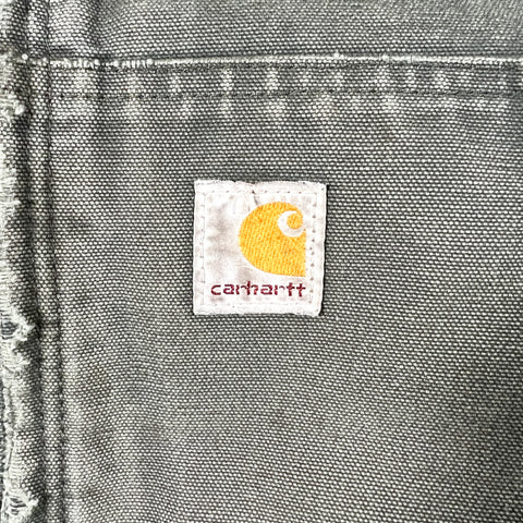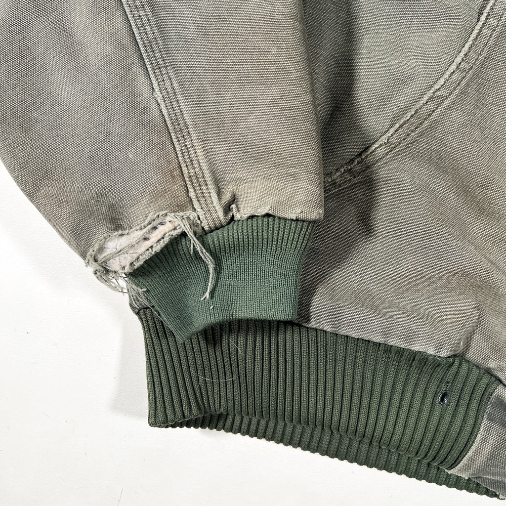 The photos show the jacket with a broken zipper at the time of shooting; however, the zipper has since been repaired and is now fully functional. This jacket is being sold AS-IS due to visible marks/stains and general wear consistent with age and use (see photos). Despite cosmetic wear, the jacket retains strong structure and heavy patina, making it ideal for rugged daily wear or for collectors of distressed Carhartt workwear.