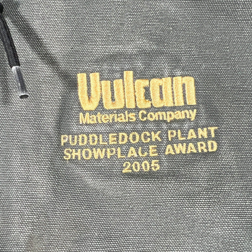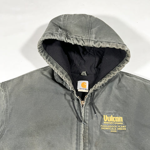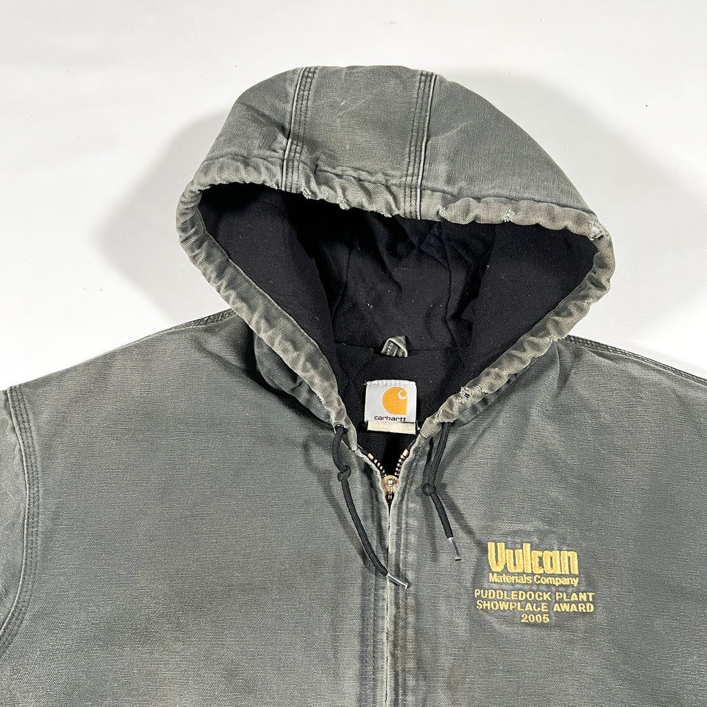 Authentic 2005 Carhartt J140 DGR Active Jacket in Dark Green (DGR) firm duck canvas with quilted thermal lining and classic hooded, zip-front workwear construction. This is the iconic Carhartt active jacket silhouette—heavyweight, boxy fit, ribbed cuffs and hem, and front kangaroo pockets. The embroidered Vulcan Materials Company – Puddledock Plant Showplace Award 2005 chest hit gives this piece unique industrial provenance.